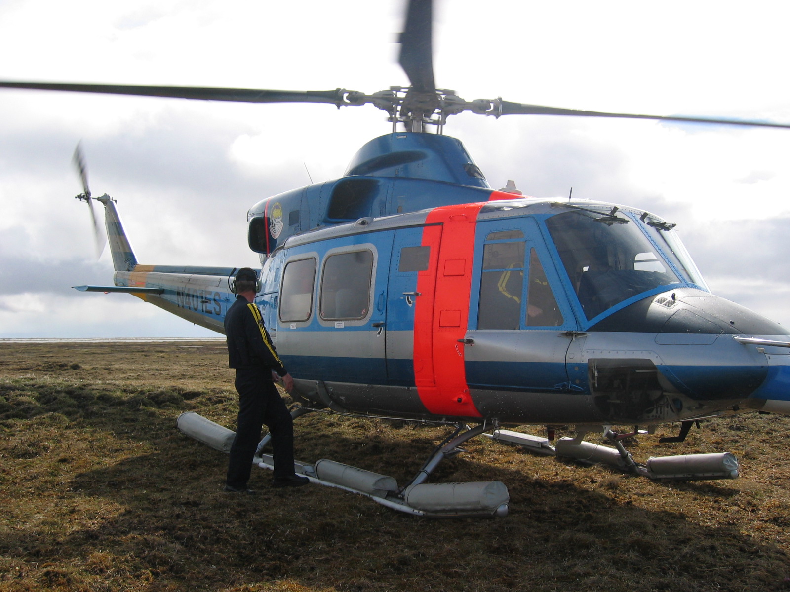 Unloading the helicopter at biologist Brian Person and TREC teacher Leslie Pierce's campsite on the Ikpikpuk Delta, near Barrow, Alaska.