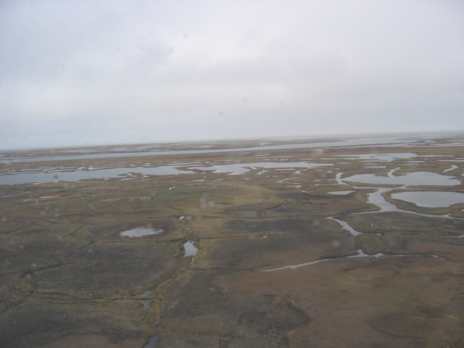 An aerial view of the tundra as seen from a helicopter heading to the Ikpikpuk Delta.