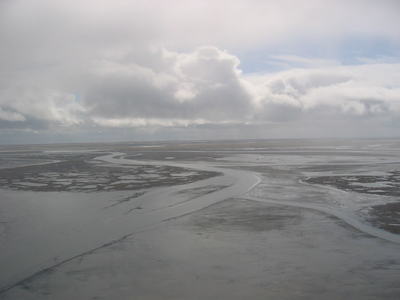 An aerial view of the tundra as seen from a helicopter heading to the Ikpikpuk Delta.
