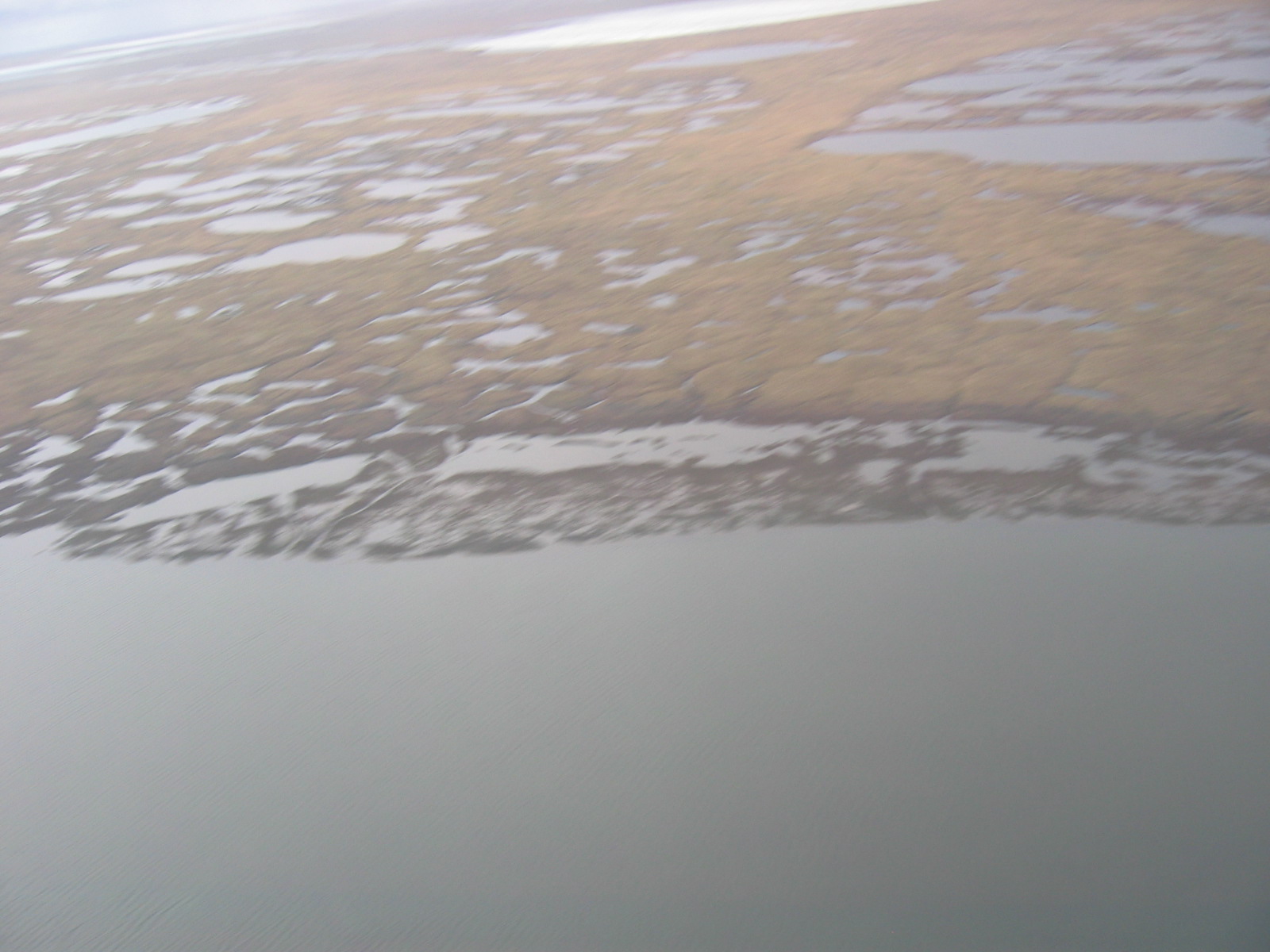 An aerial view of the tundra as seen from a helicopter heading to the Ikpikpuk Delta.