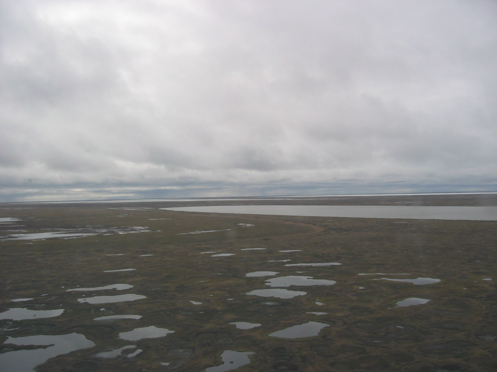 An aerial view of the tundra around Barrow, Alaska as seen from a helicopter heading to the Ikpikpuk Delta.