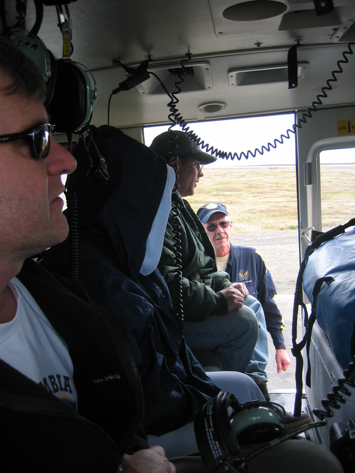 Loaded into the helicopter and ready to go (L to R: biologist Robert Suydam, student Clarinda, biologist Brian Person).