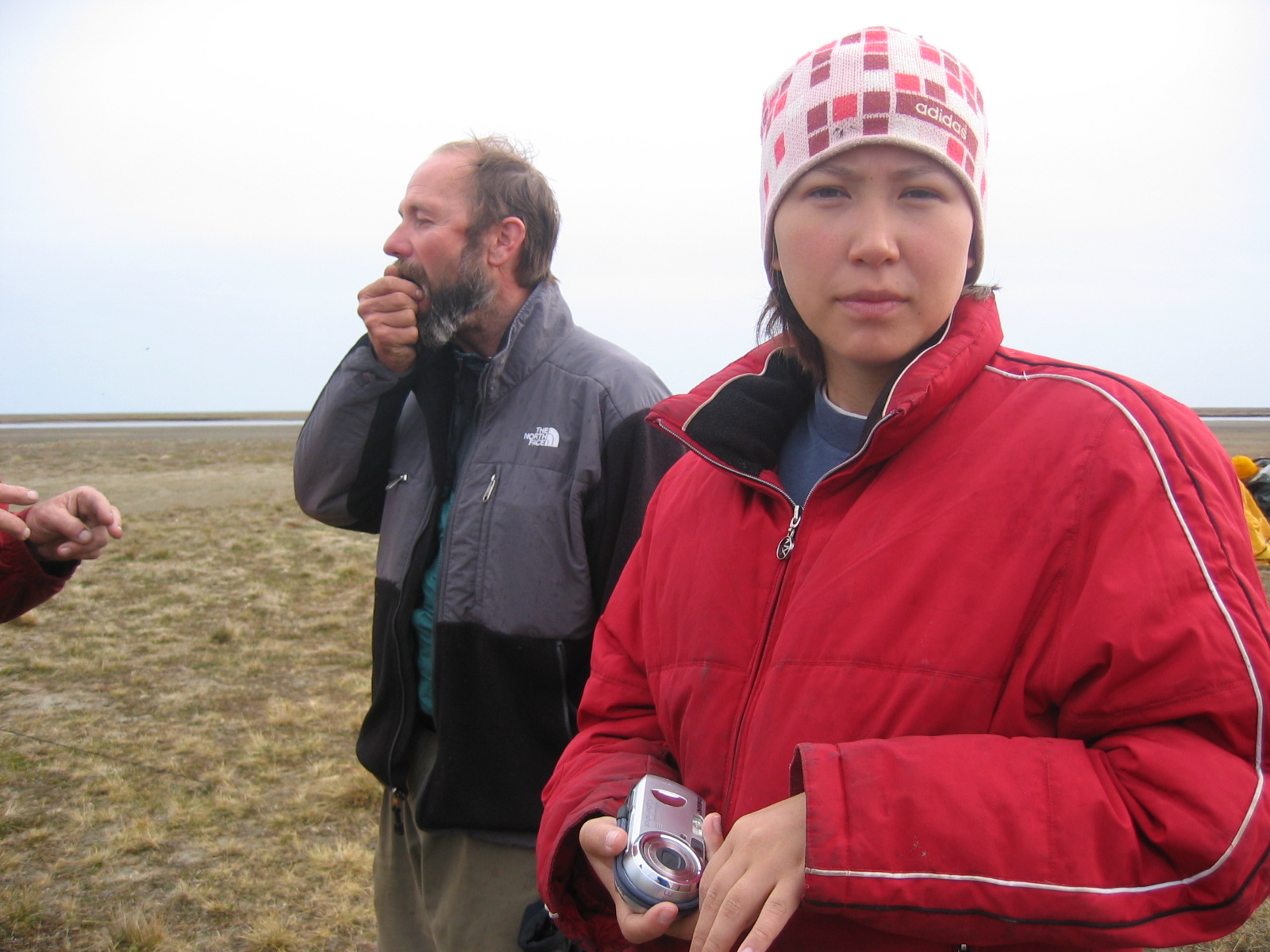 Rita Acker with John Rose in the background, near Barrow, Alaska.