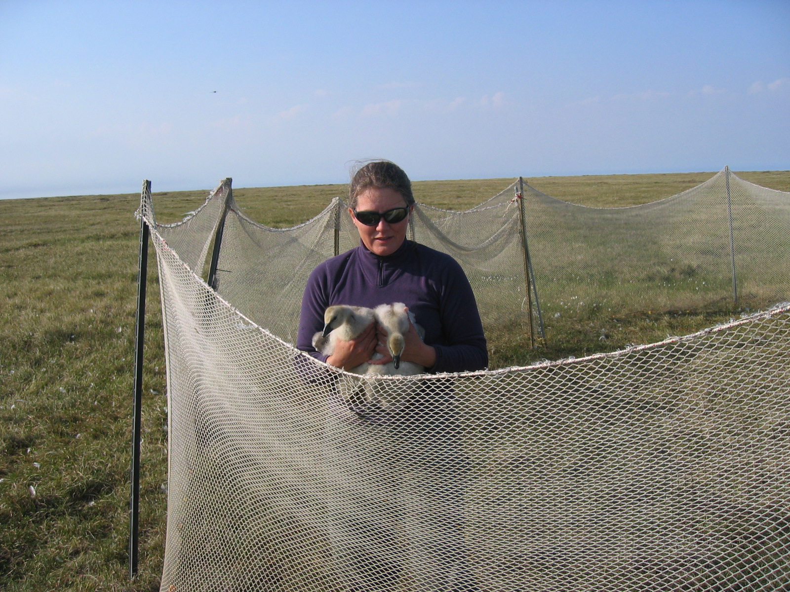 TREC teacher Leslie Pierce holds two snow goose (*Chen caerulescens*) goslings during banding, near Barrow, Alaska.