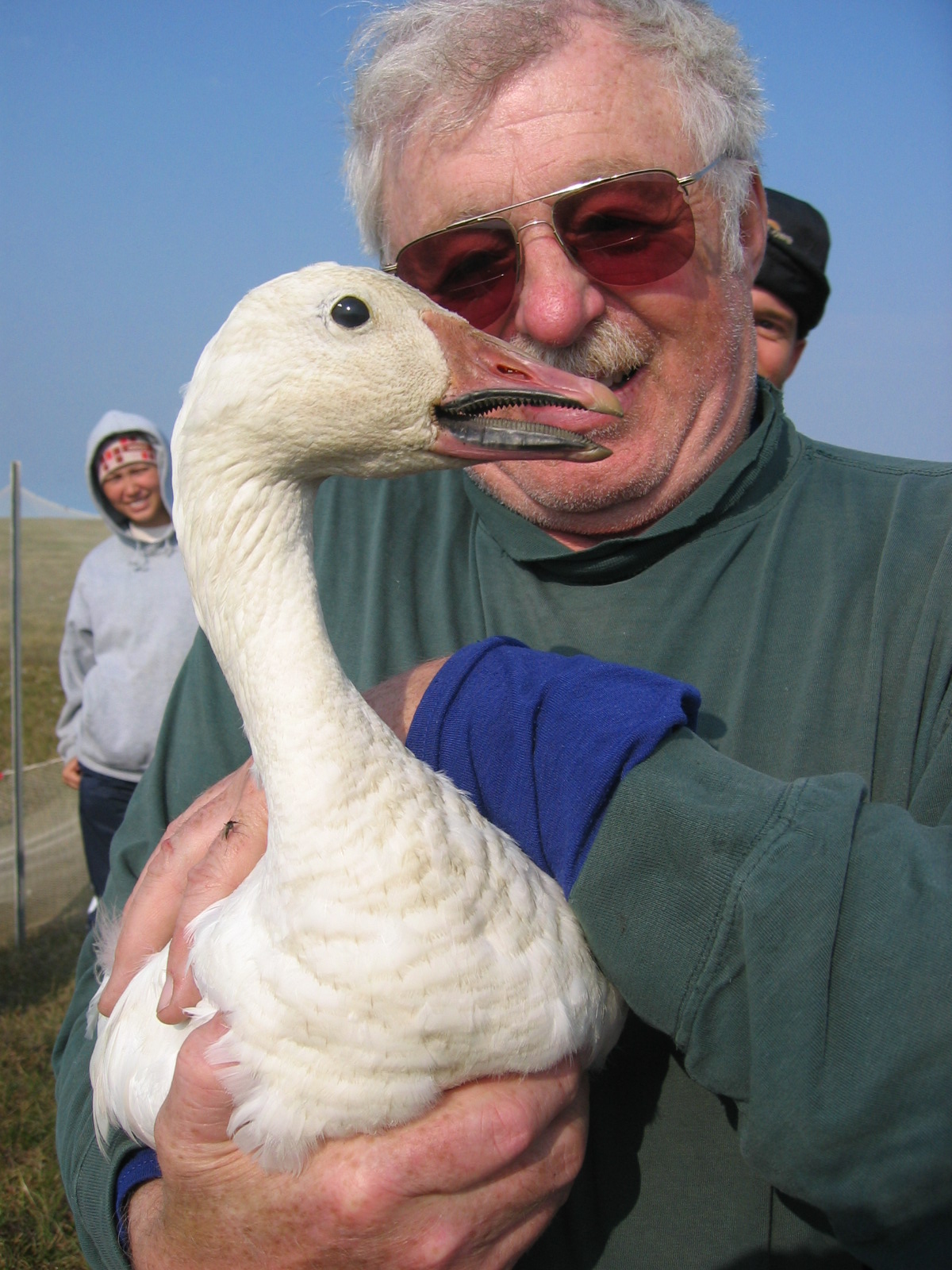 Pilot Sandy Hamilton holds a snow goose (*Chen caerulescens*) during banding near Barrow, Alaska.