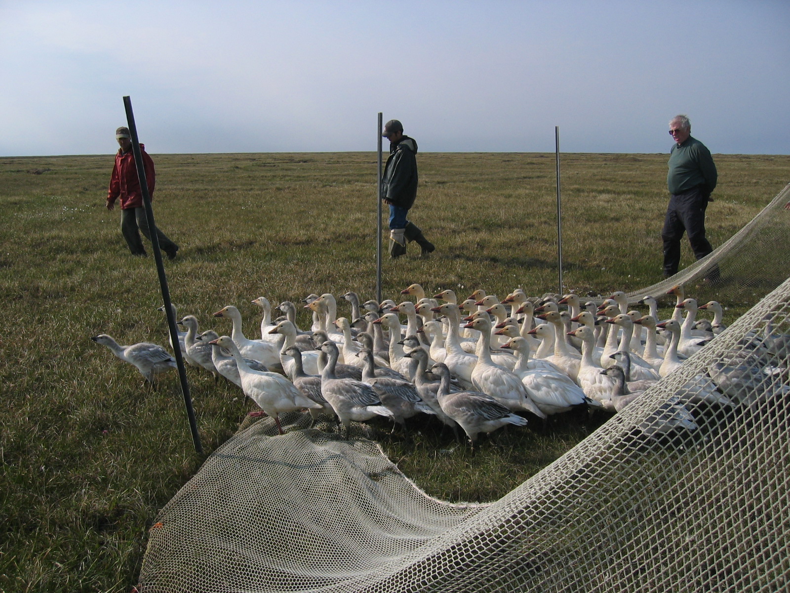 The snow geese (*Chen caerulescens*) are released after banding, near Barrow, Alaska.