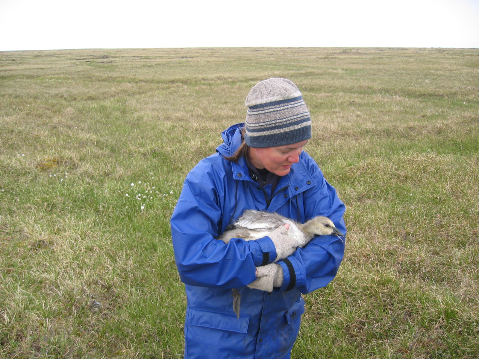 TREC teacher Leslie Pierce holds a snow goose (*Chen caerulescens*) to be banded near Barrow, Alaska.