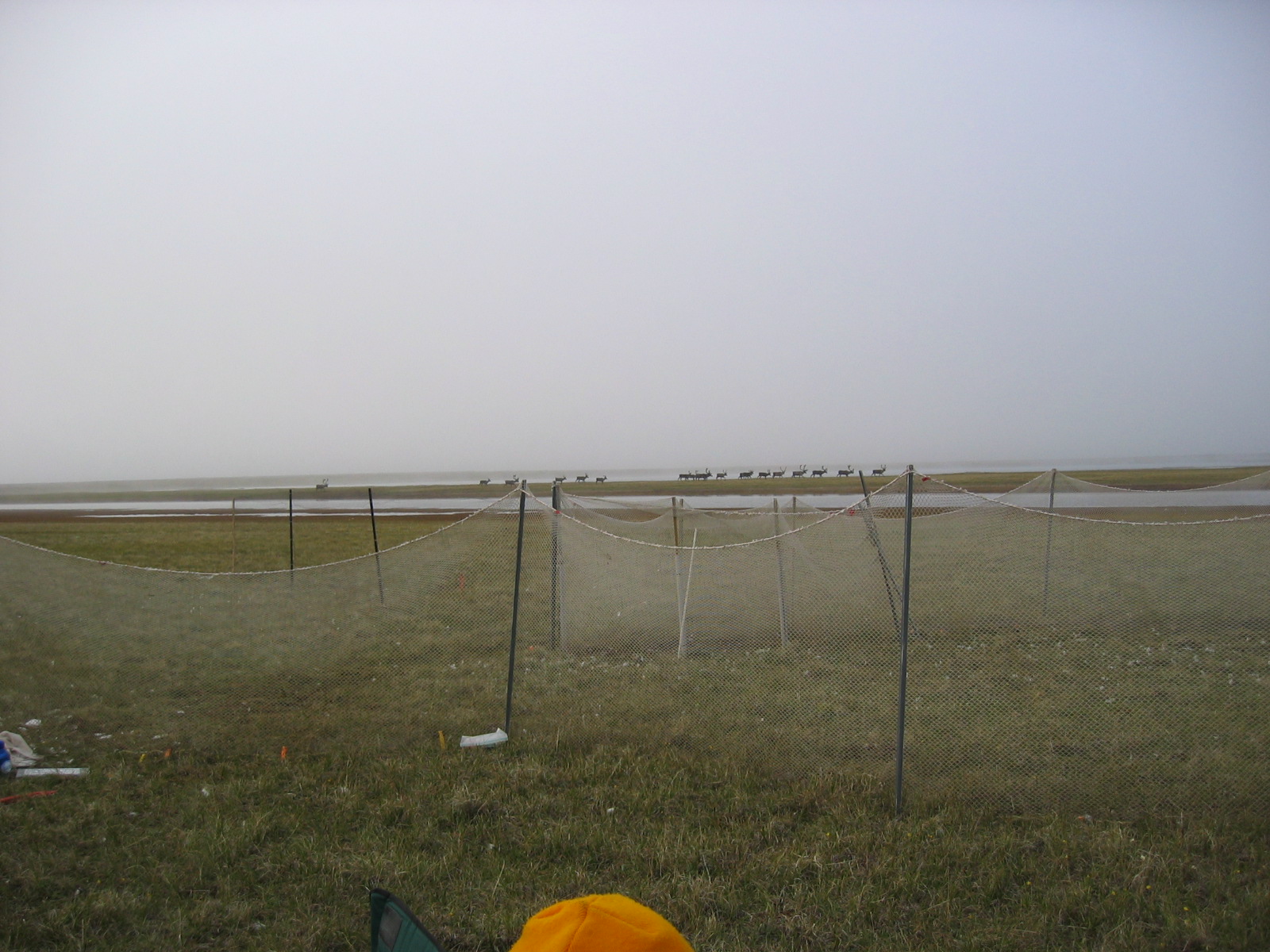 A group of caribou walk by a snow goose holding pen near Barrow, Alaska.