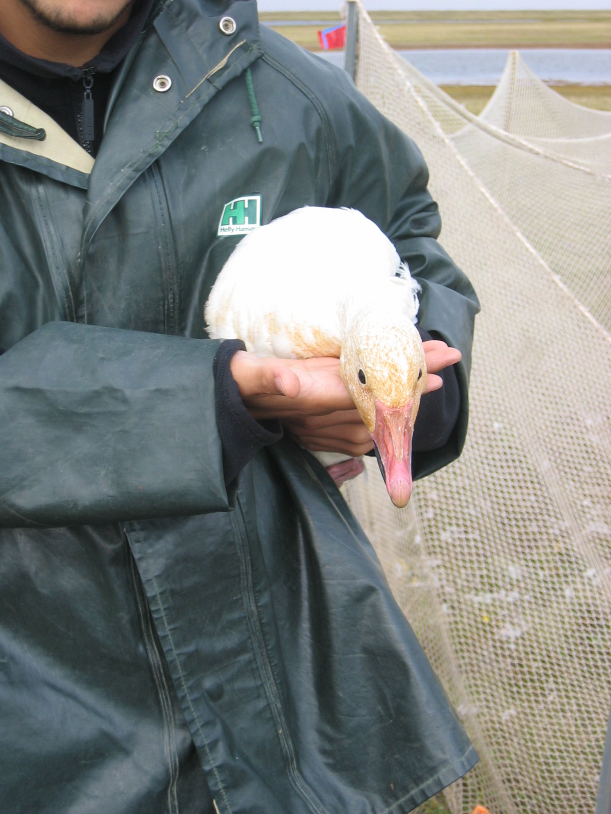 Jeremy Maguire holds a snow goose (*Chen caerulescens*) during banding near Barrow, Alaska.