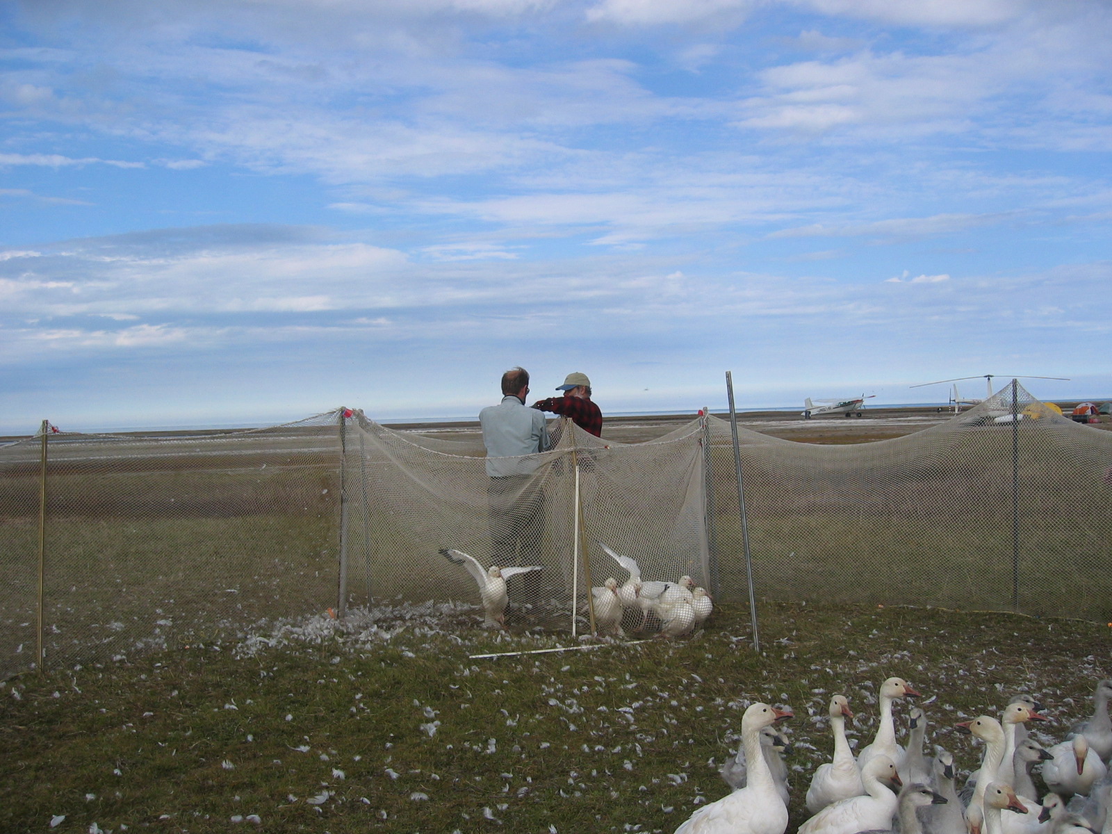 John Rose from ABR, Inc. herds snow geese (*Chen Caerulescens*) within a holding pen on the Ikpikpuk Delta, near Barrow, Alaska