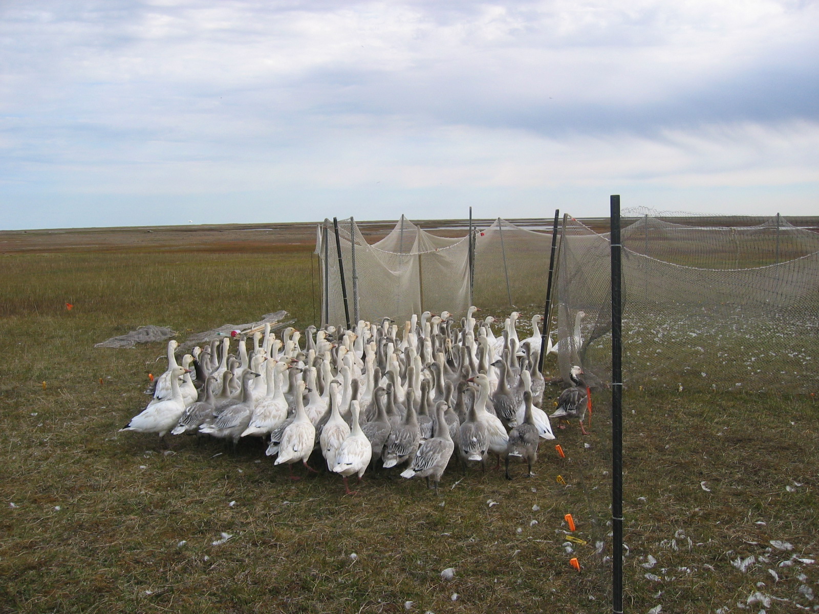 Herding snow geese (*Chen caerulescens*) towards a pen to be banded on the Ikpikpuk Delta, near Barrow, Alaska.