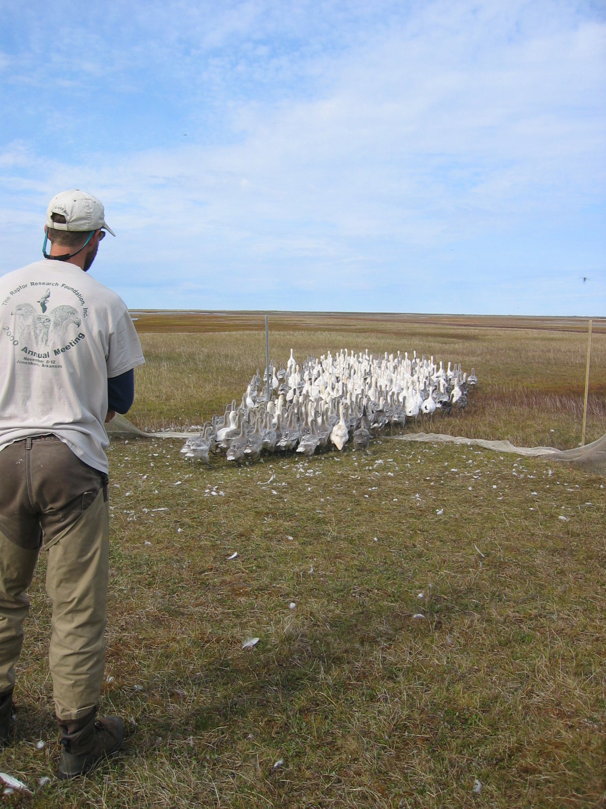John Shook from ABR, Inc. moves some snow geese (*Chen caerulescens*) towards the exit of the pen after banding. Ikpikpuk Delta, near Barrow, Alaska.