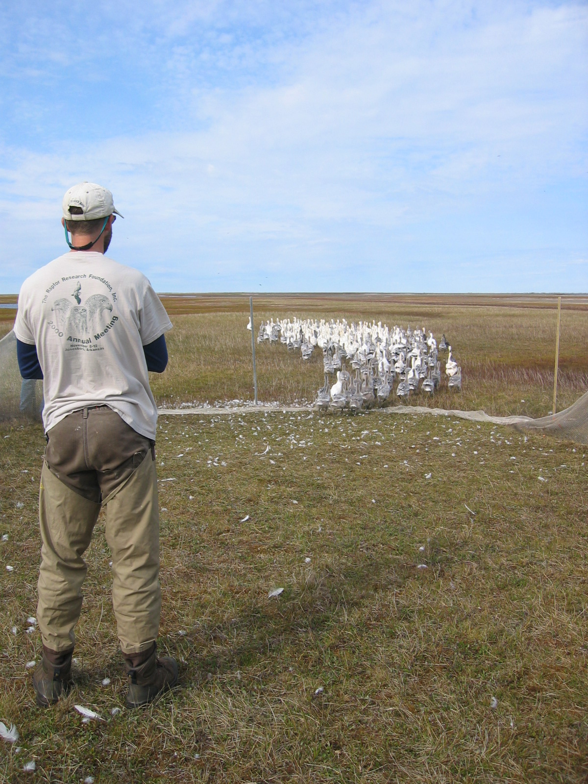 John Shook from ABR, Inc. moves some snow geese (*Chen caerulescens*) towards the exit of the pen after banding. Ikpikpuk Delta, near Barrow, Alaska.