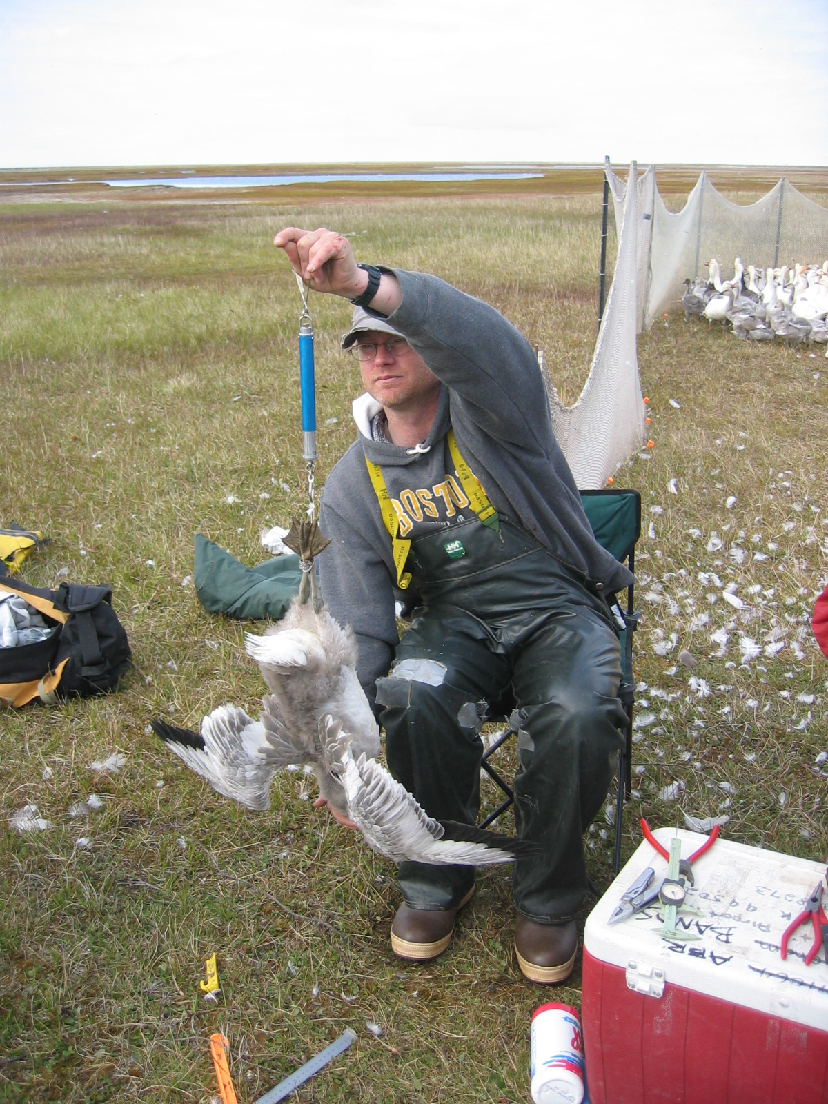Brian Person weighs a snow goose (*Chen caerulescens*) during banding on the Ikpikpud Delta, near Barrow, Alaska.