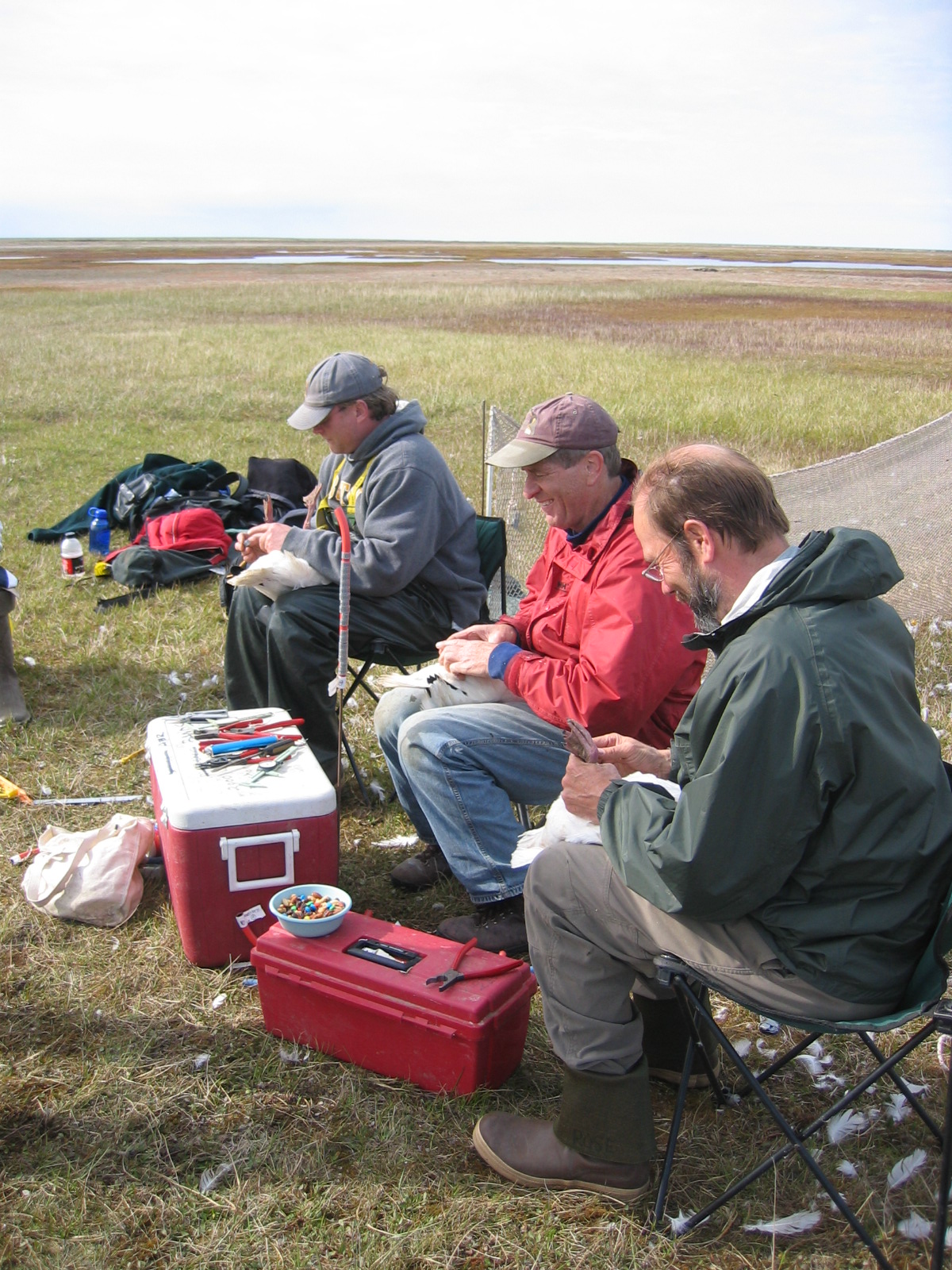 Banding snow geese (*Chen caerulescens*), Ikpikpuk delta near Barrow, AK. The banders are Brian Person, Bob Richie, and John Rose.