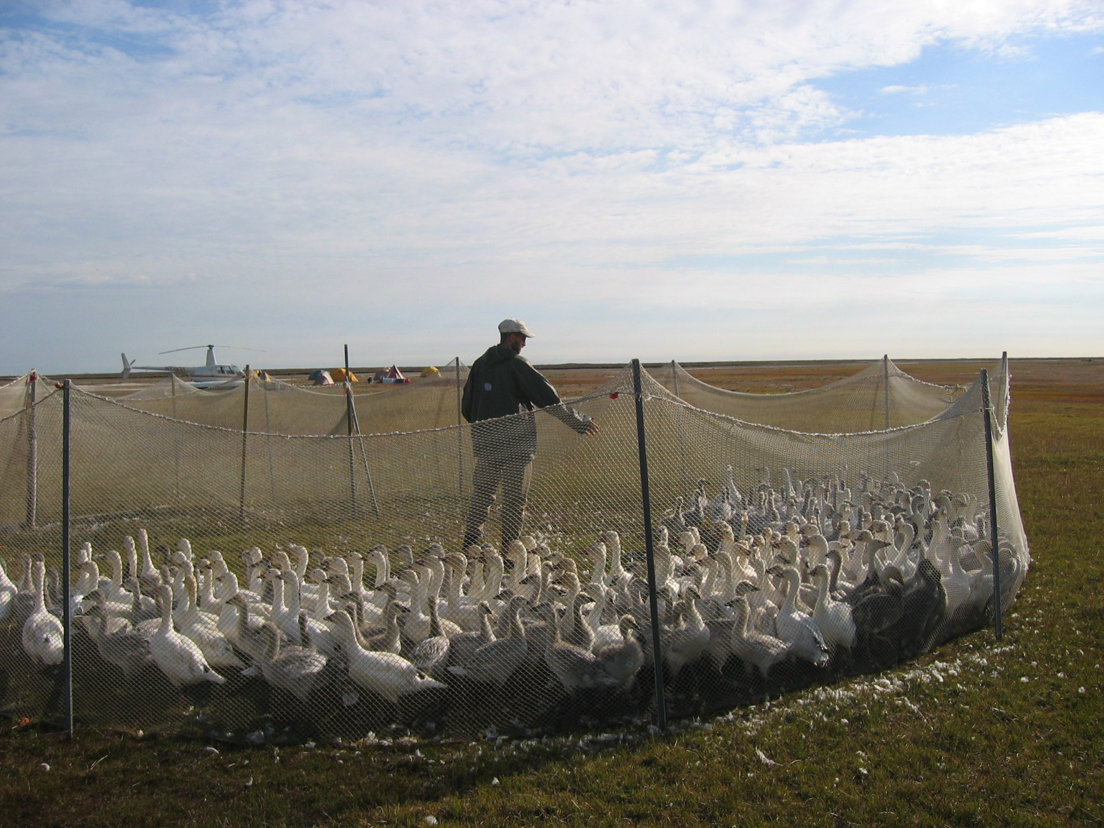 Snow geese (*Chen caerulescens*) wait in a pen to be banded, Ikpikpuk delta near Barrow, AK.