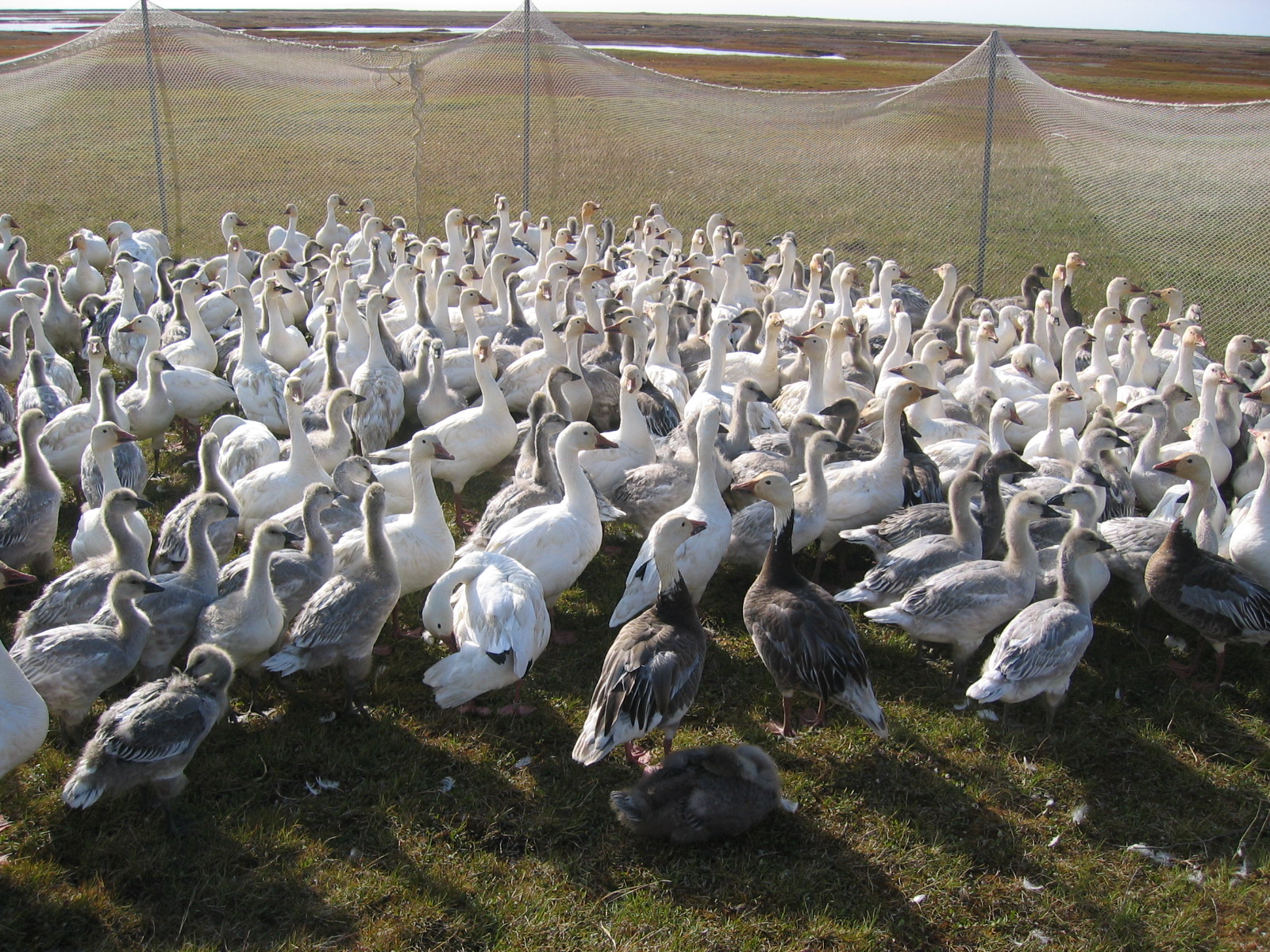 Snow geese (*Chen caerulescens*) wait in a pen to be banded, Ikpikpuk delta near Barrow, AK.