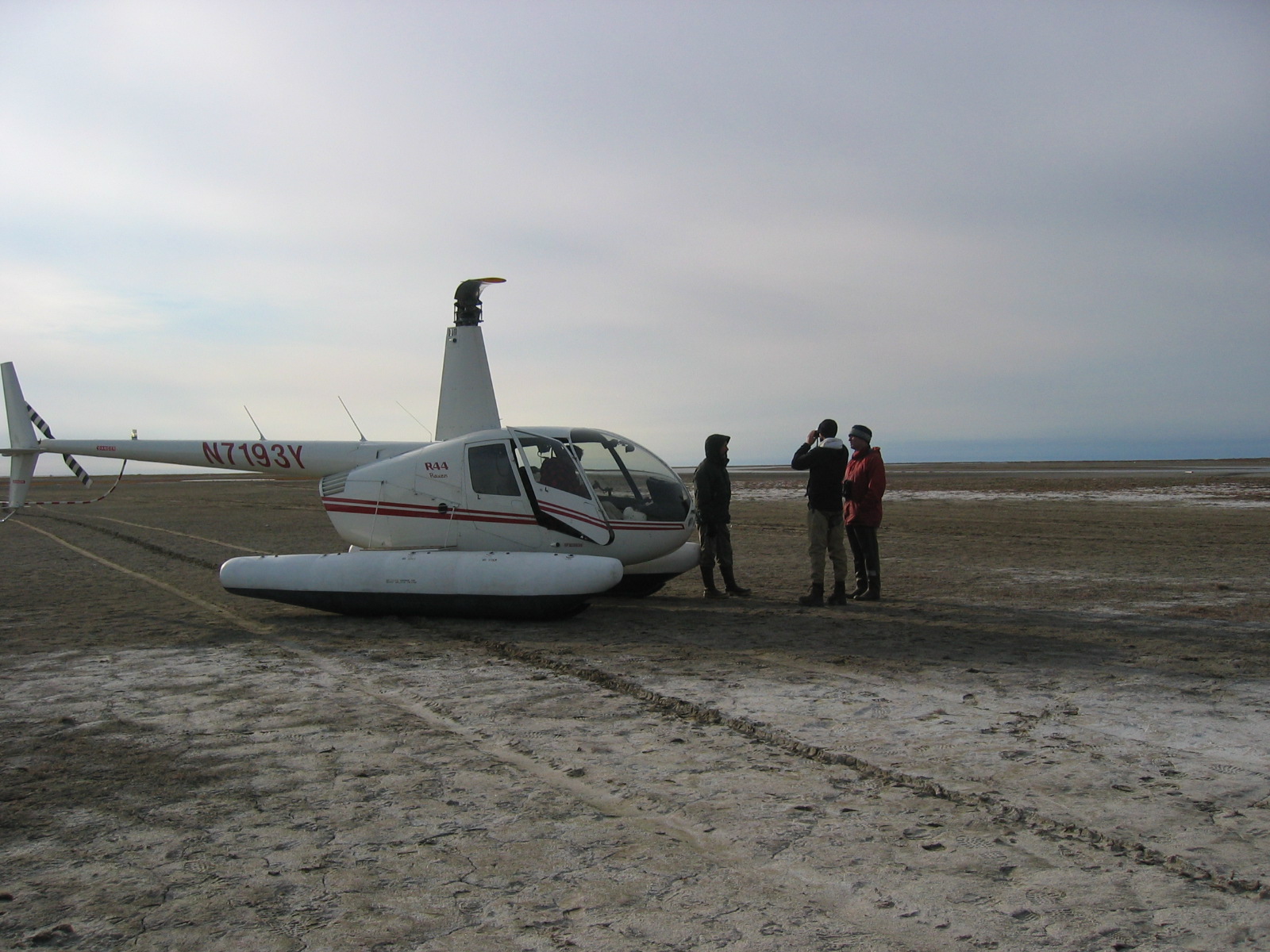 A helicopter sitting on the tundra of the Ikpikpuk delta near Barrow, AK.