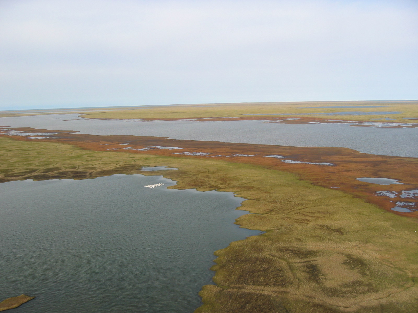 Flying over the tundra near Barrow, AK. A group of snow geese (*Chen caerulescens*) can be seen on the edge of the water.