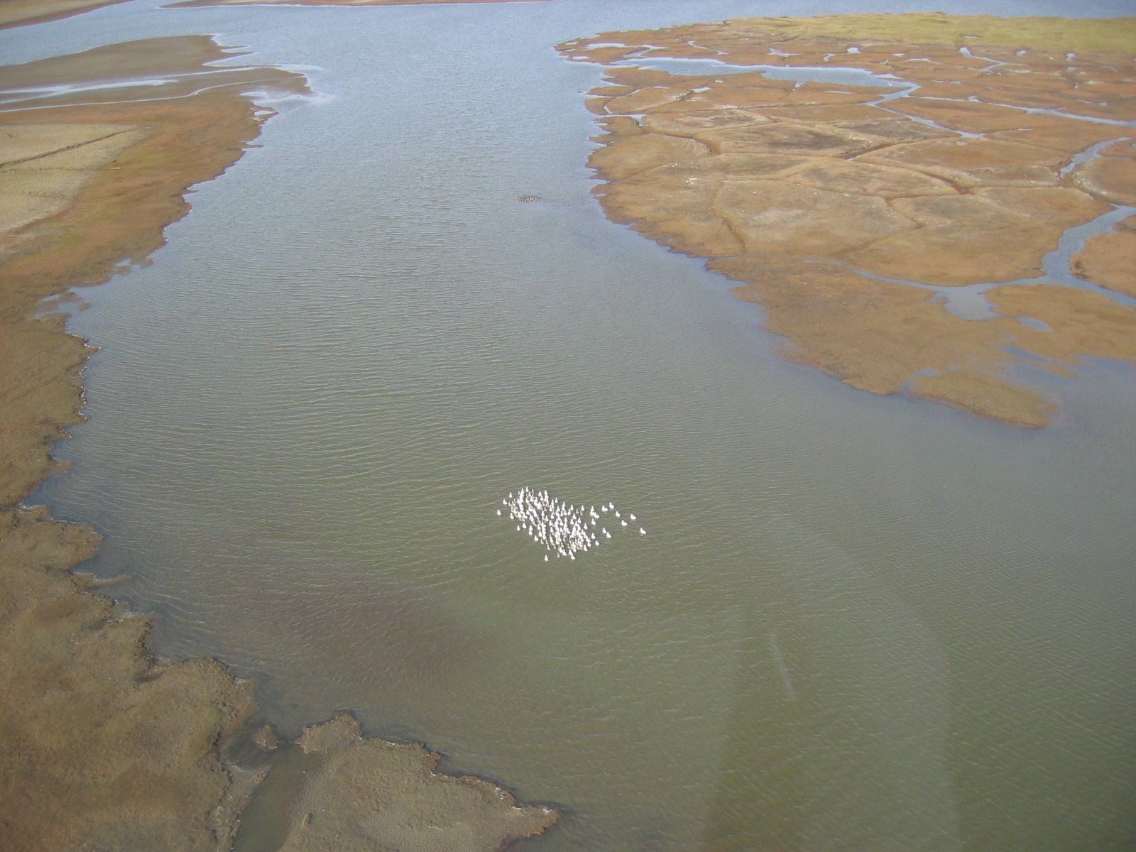 A group of snow geese (*Chen caerulescens*) on a pond located on the Ikpikpuk delta near Barrow, AK.