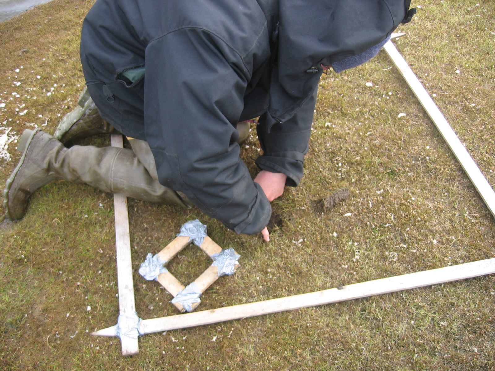 Biologist Brian Person cuts out a turve, or a 10cm square cut out that is brought back to clip in the lab or if clipped in the field, it is cut out as a marker for next year's data collecting, of grazing lawn on the Ikpikpuk Delta.