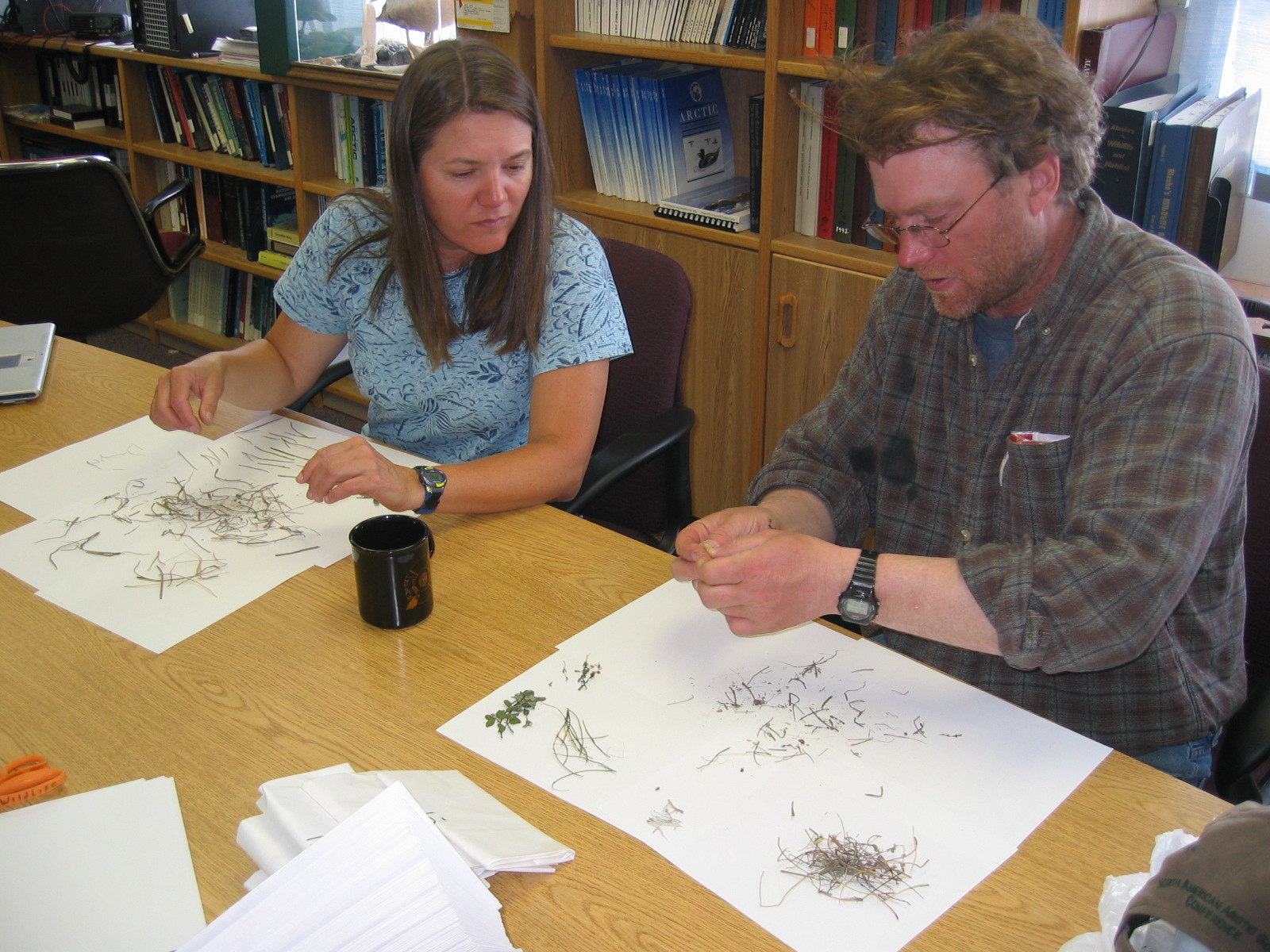 Biologist Brian Person and TREC teacher Leslie Pierce sort vegetation samples collected from the Ikpikpuk Delta into genis and species.