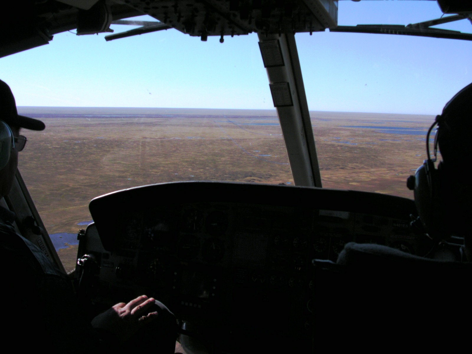A view of the Ikpikpuk Delta seen through the cockpit of a helicopter.