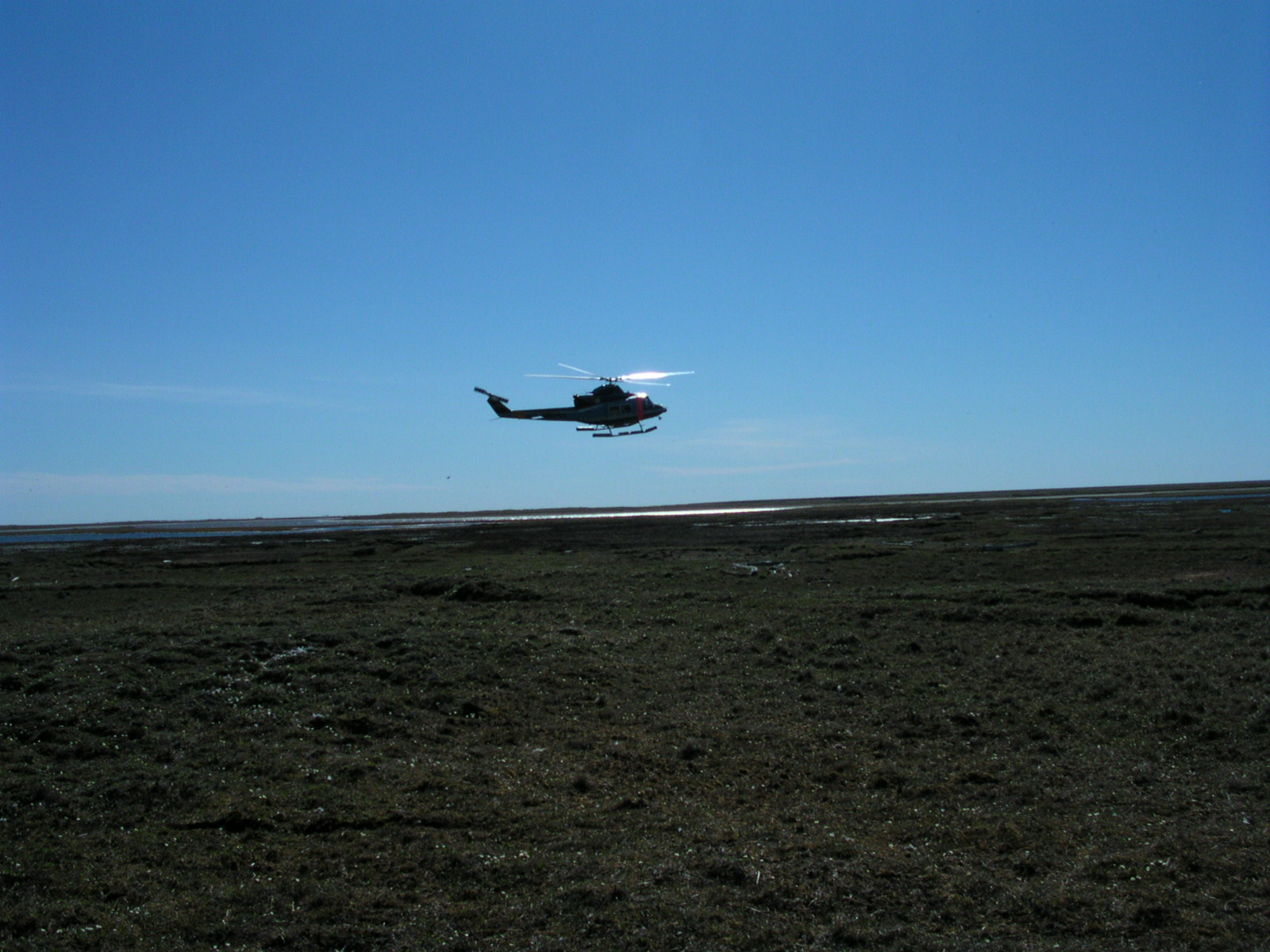 A helicopter flying over the Ikpikpuk Delta coming to pick up TREC teacher Leslie Pierce and biologist Brian Person.
