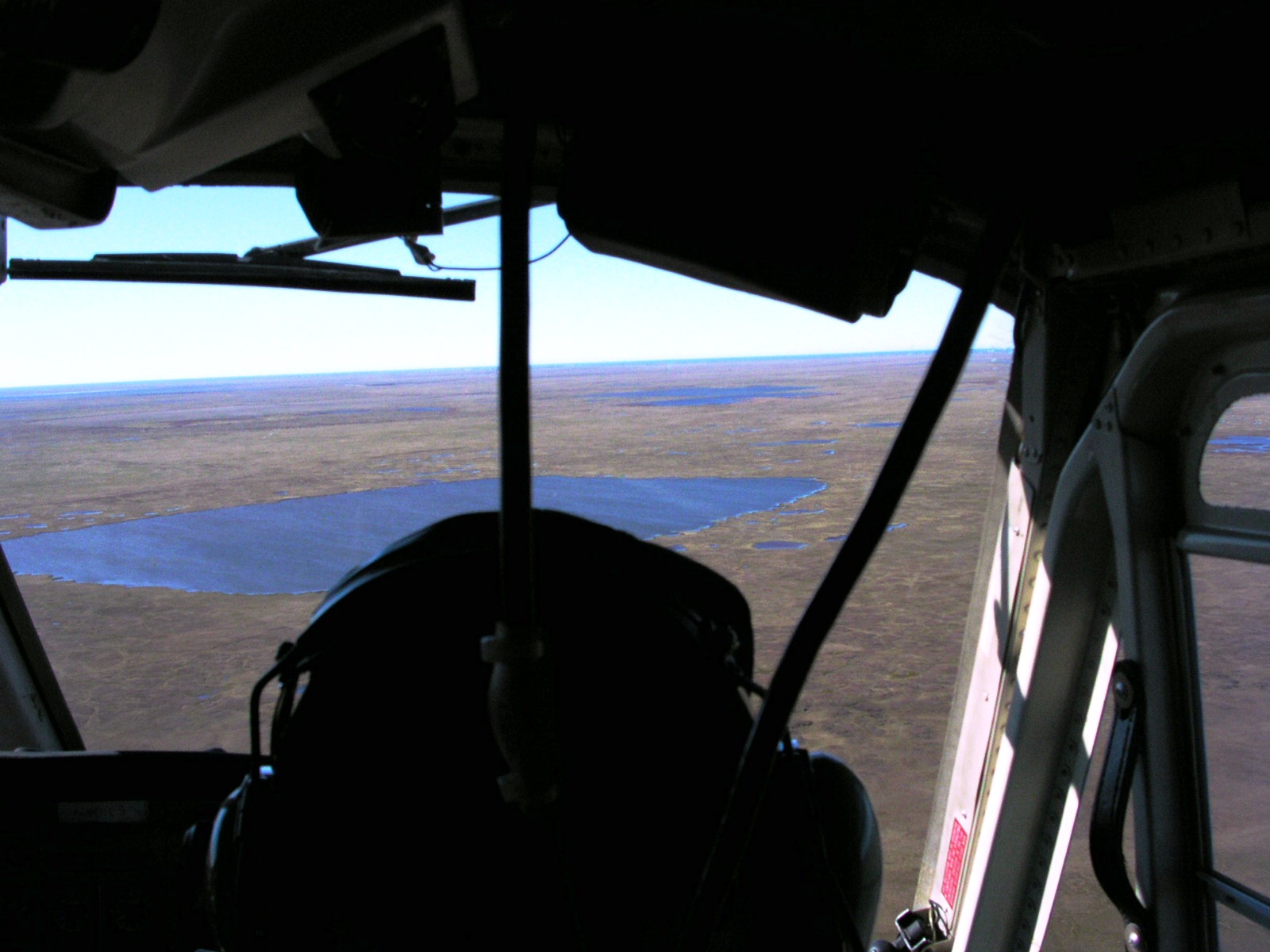 A view of the Ikpikpuk Delta seen through the cockpit of a helicopter.