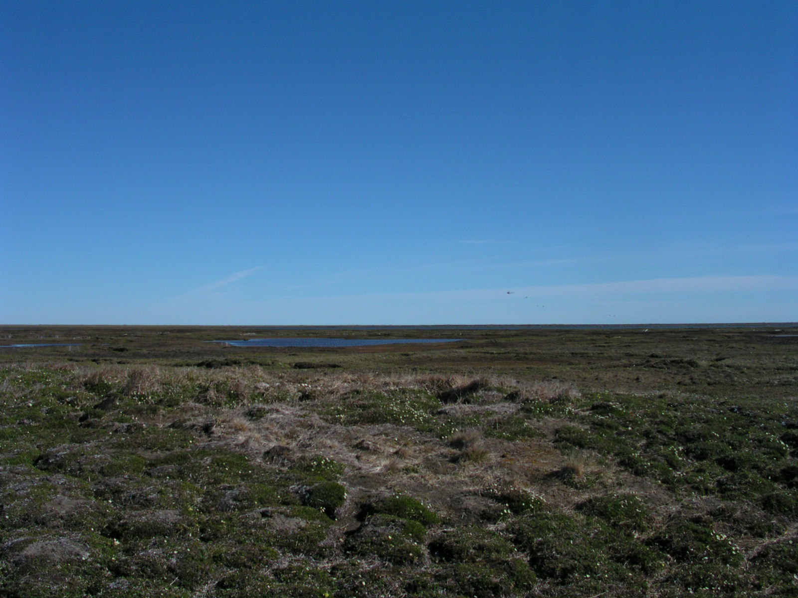 A view of some of the tundra of the Ikpikpuk Delta. You can see some grubbing, or de-vegetation caused by the grazing of snow geese (*Chen caerulescens*)/