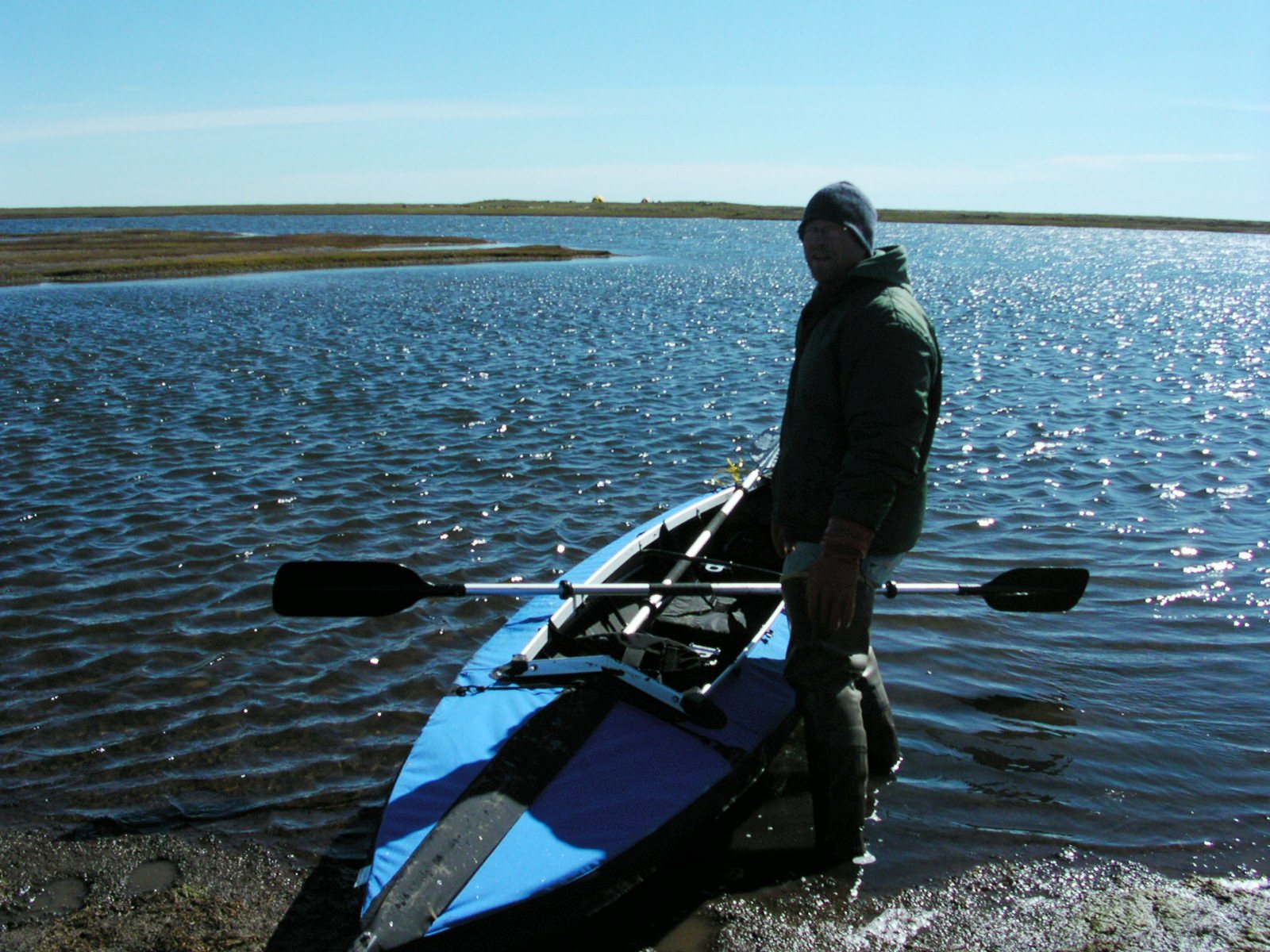 Biologist Brian Person stands by a collapsible kayak on the Ikpikpuk Delta.