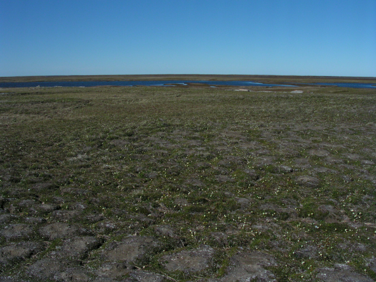 A view of some of the tundra of the Ikpikpuk Delta. You can see some grubbing, or de-vegetation caused by the grazing of snow geese (*Chen caerulescens*)/