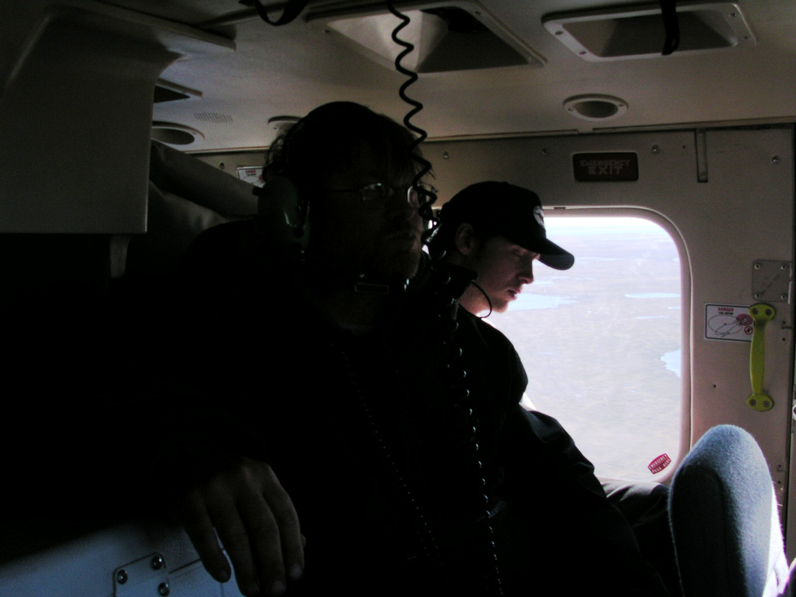 Brian Person and Josh Bacon ride in a helicopter, near Barrow, Alaska.