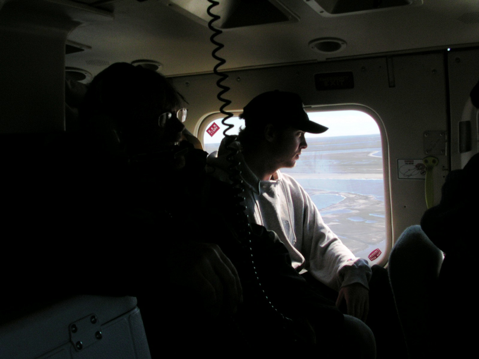 Brian Person and Josh Bacon ride in a helicopter, near Barrow, Alaska.
