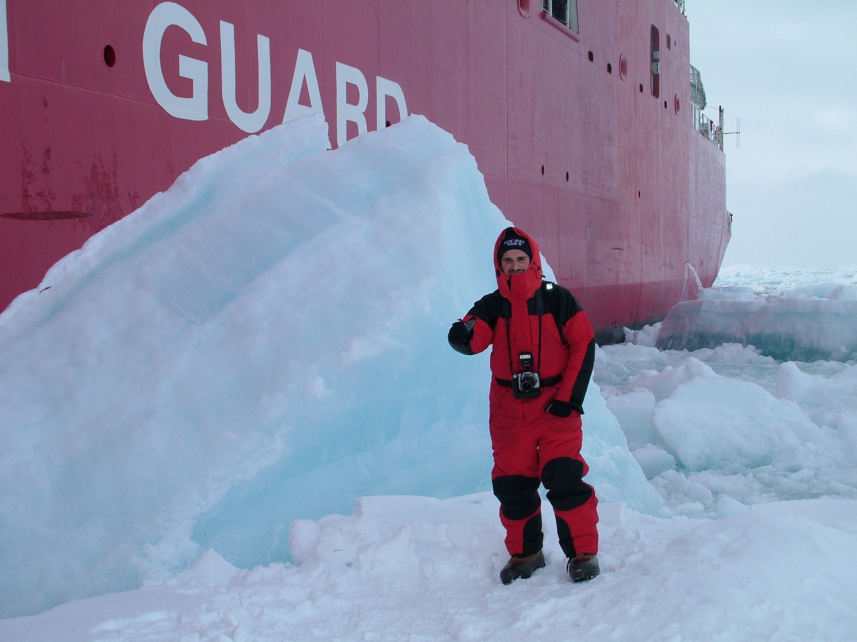 The crew of the USCGC Healy enjoy an ice liberty somewhere on the Arctic Ocean. Alejandro Sayegh from Venezuala pictured.