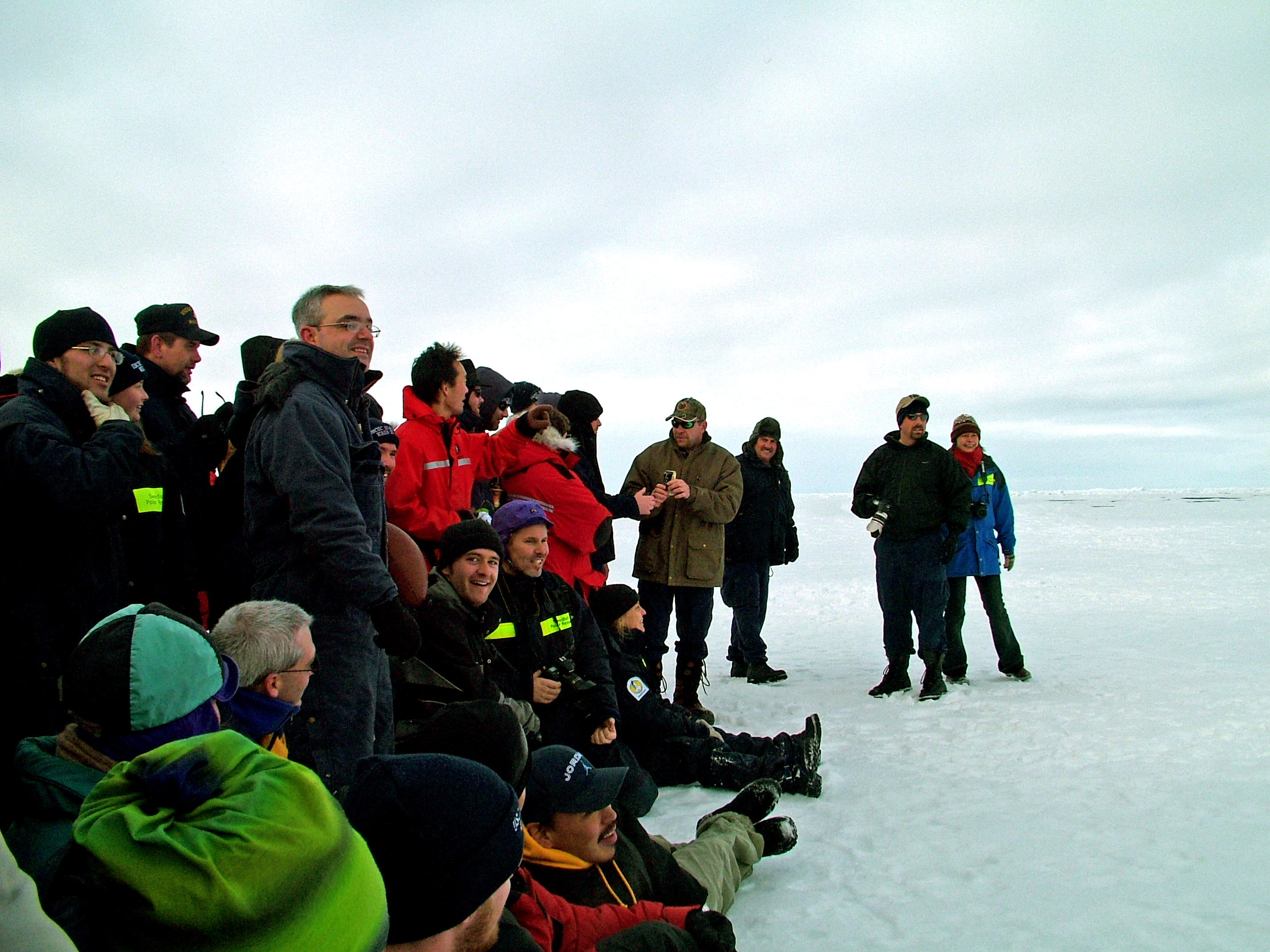 The crew of the USCGC Healy enjoy an ice liberty somewhere on the Arctic Ocean.