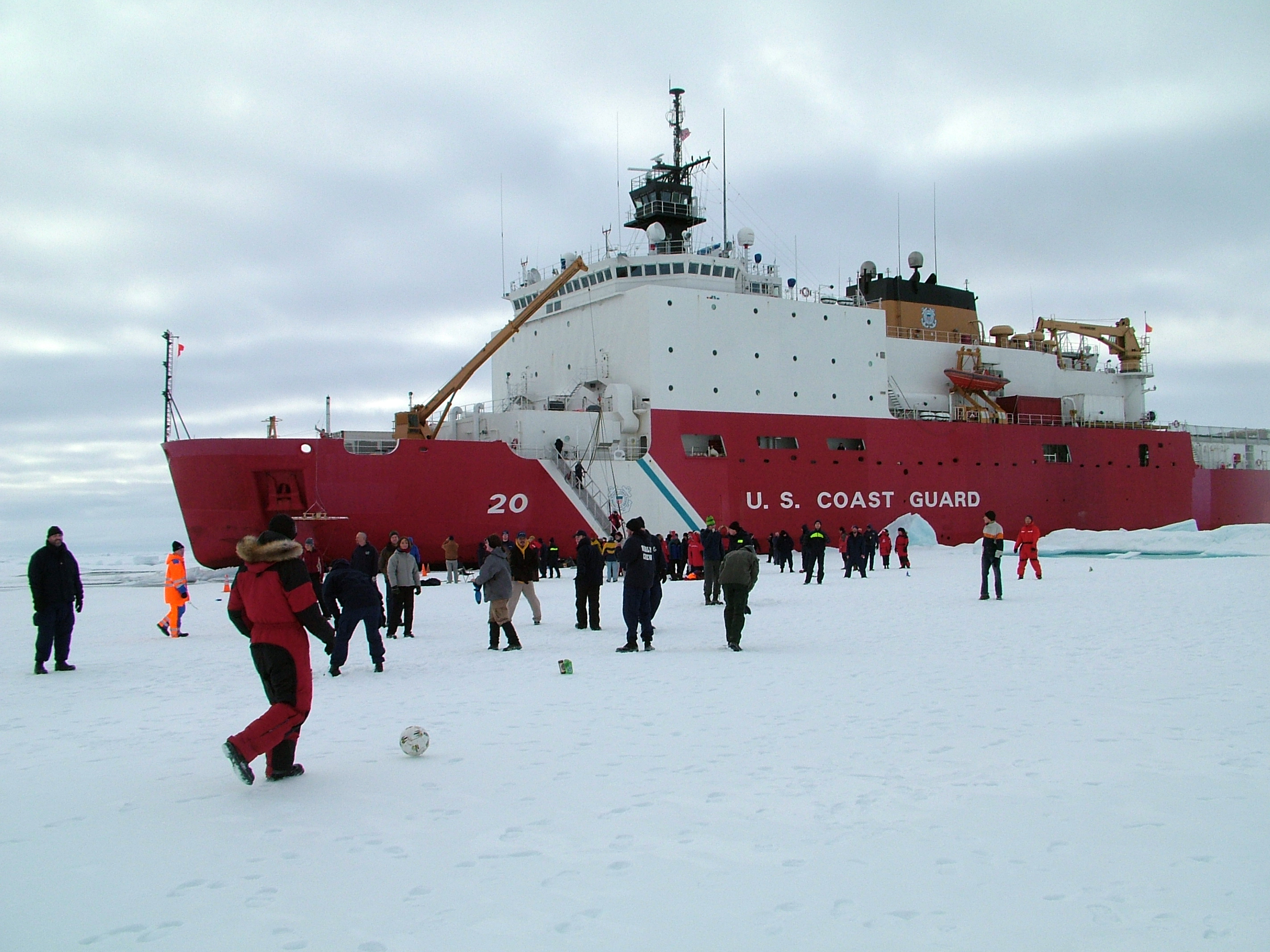 The crew of the USCGC Healy enjoy an ice liberty somewhere on the Arctic Ocean.