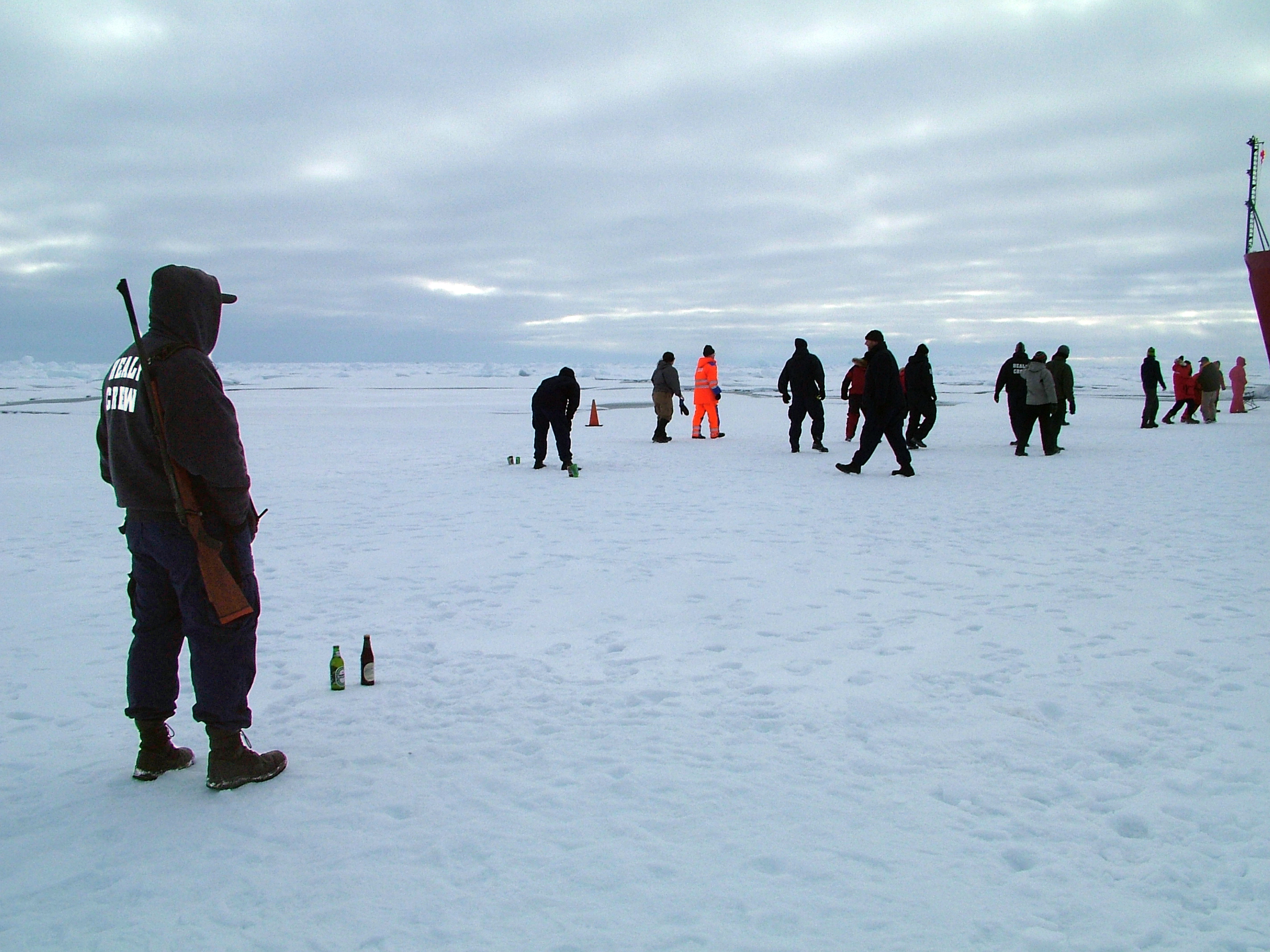 The crew of the USCGC Healy enjoy an ice liberty somewhere on the Arctic Ocean while a crew member stands watch for polar bears.