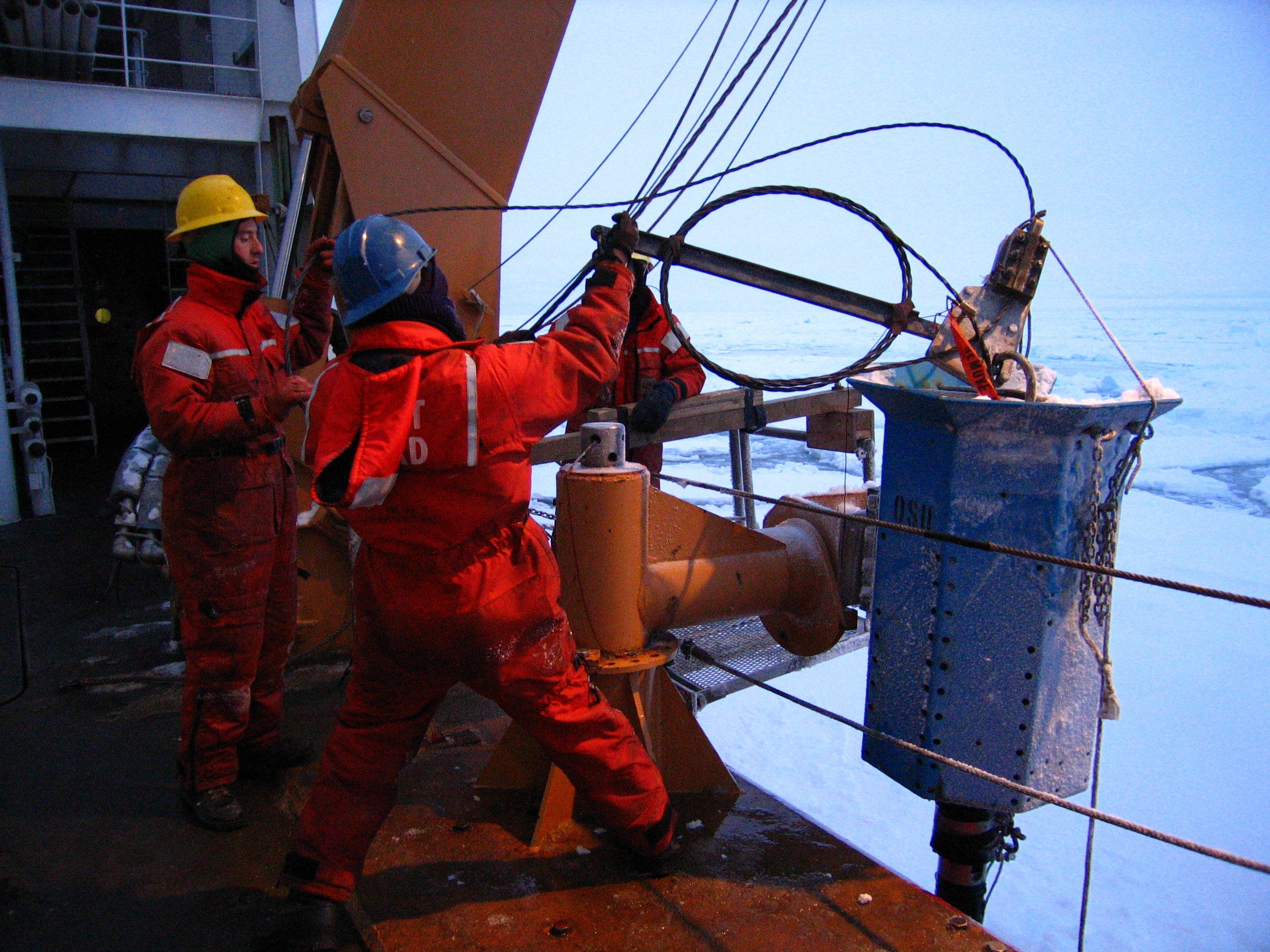 Preparing to take a sea floor core with the Jumbo Piston Core (JPC) on board the USCGC Healy.