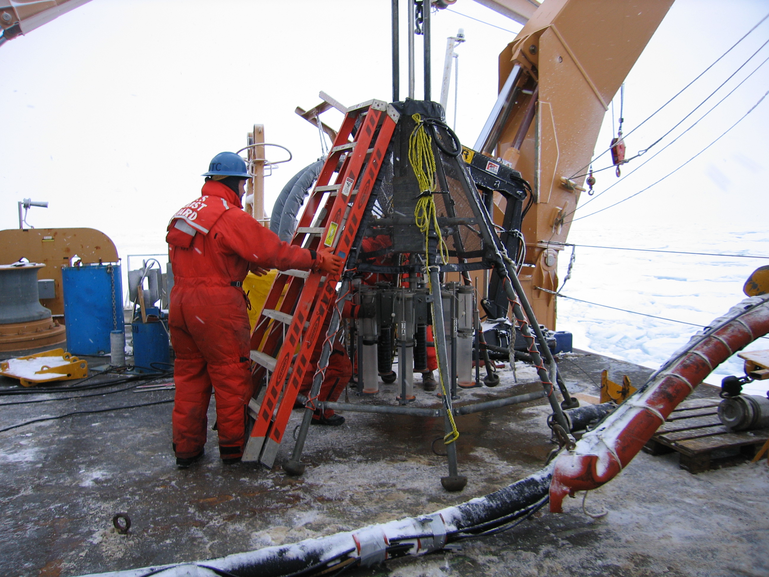 Collecting a multicore sediment sample from the sea floor of the Arctic Ocean, on board the USCGC Healy.