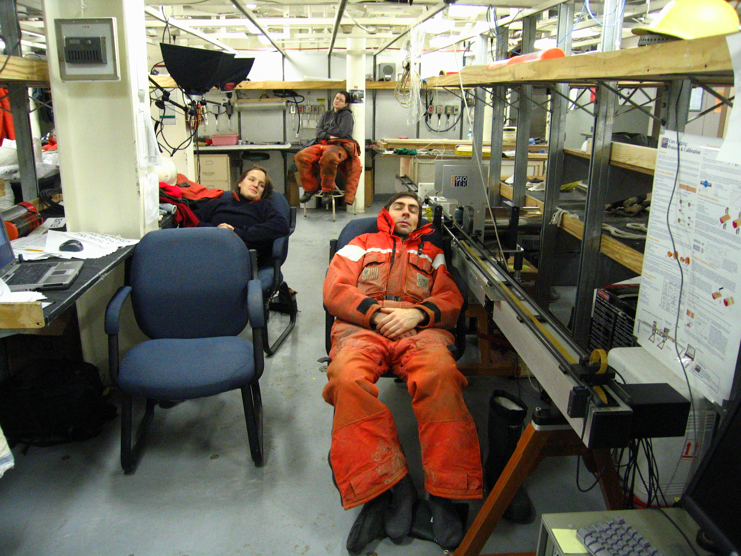 Research team members resting between collecting sediment cores on the USCGC Healy.