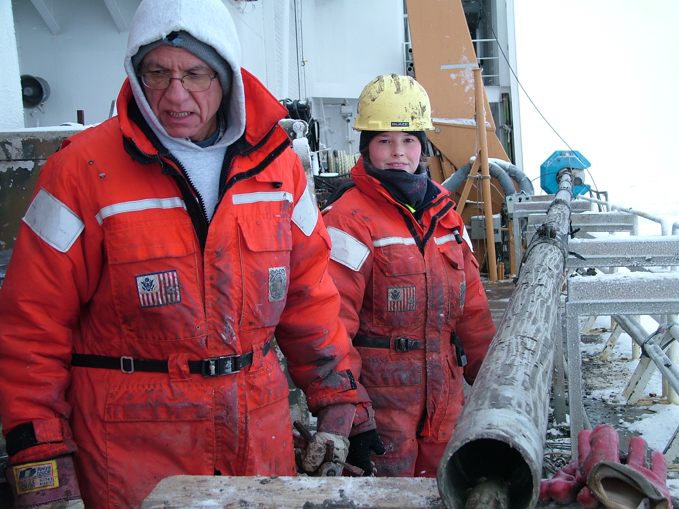 Researcher Dennis Darby and Emma Sellen cutting our last Jumbo Piston Core (JPC) core, on board the USCGC Healy
