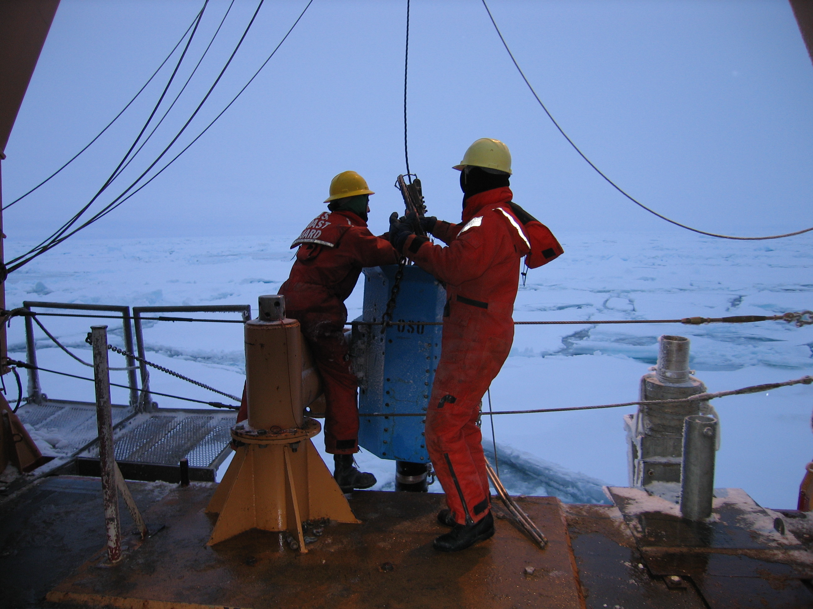 Preparing to take a sea floor core with the Jumbo Piston Core (JPC) on board the USCGC Healy.