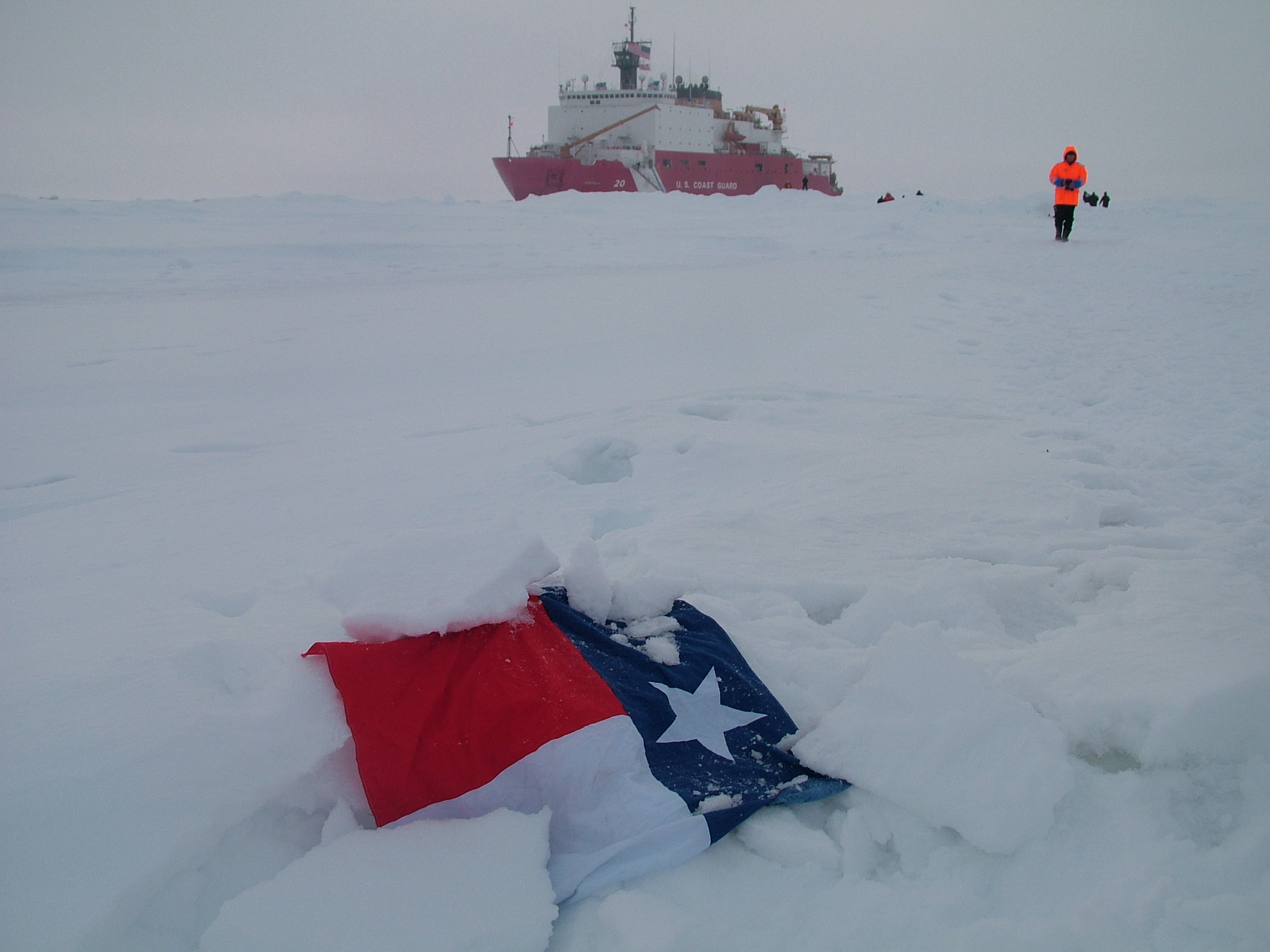 A view of the US Coast Guard (USCG) Icebreaker Healy with the Texas flad in the foreground.