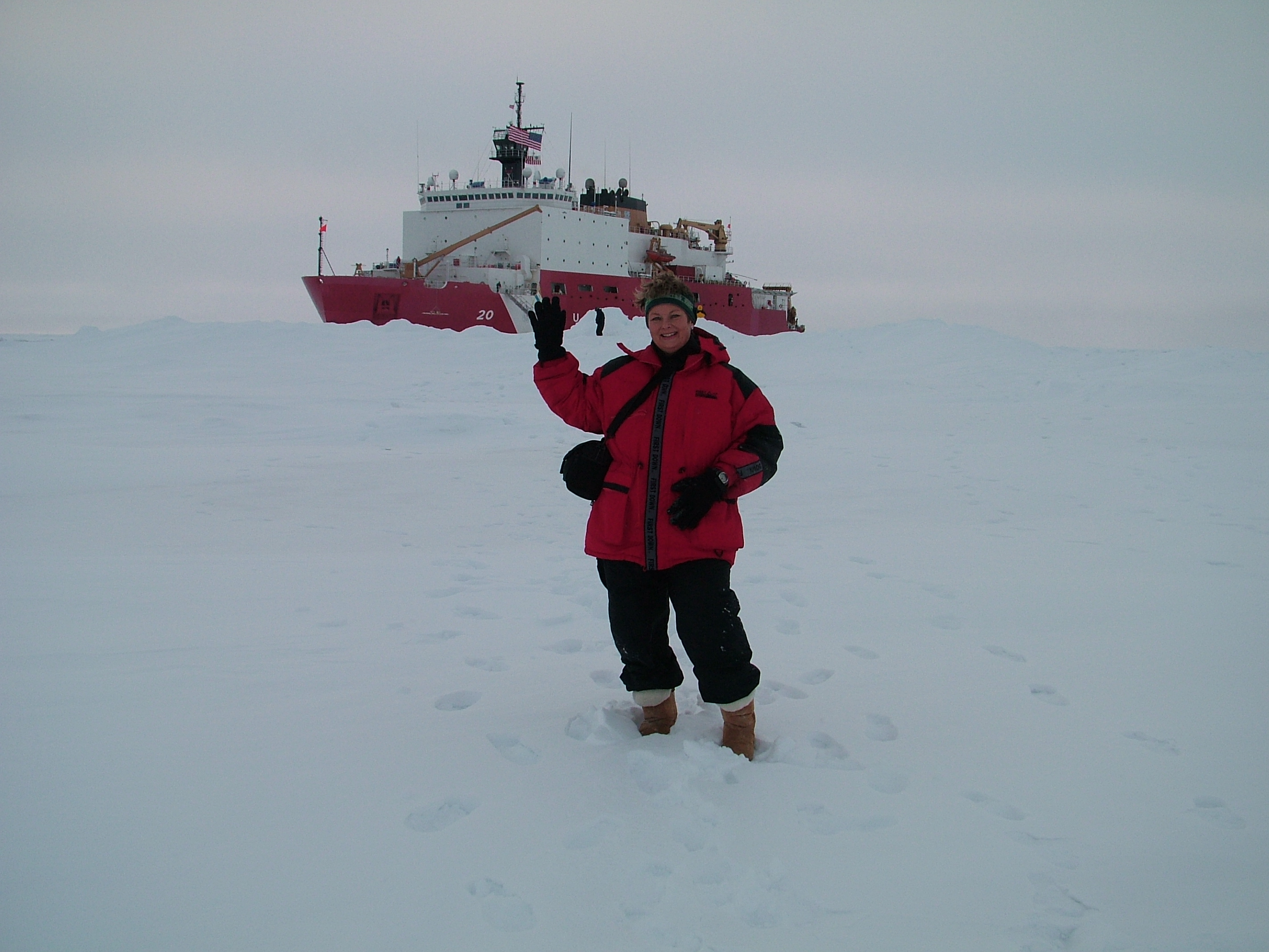 A view of the US Coast Guard (USCG) Icebreaker Healy and TREC teacher Ute Kaden.