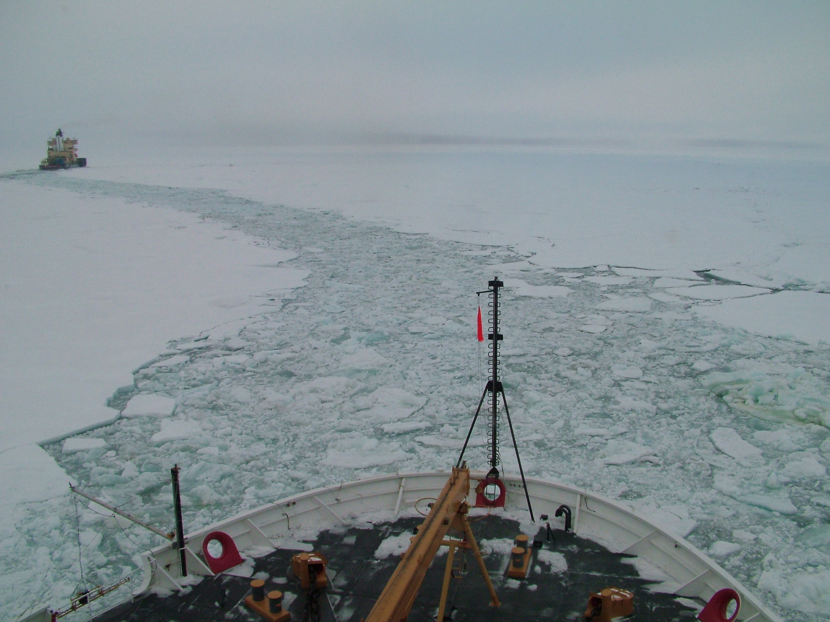 The USCGC Healy follows behind the Swedish icebreaker Oden as they break ice through the Arctic Ocean.