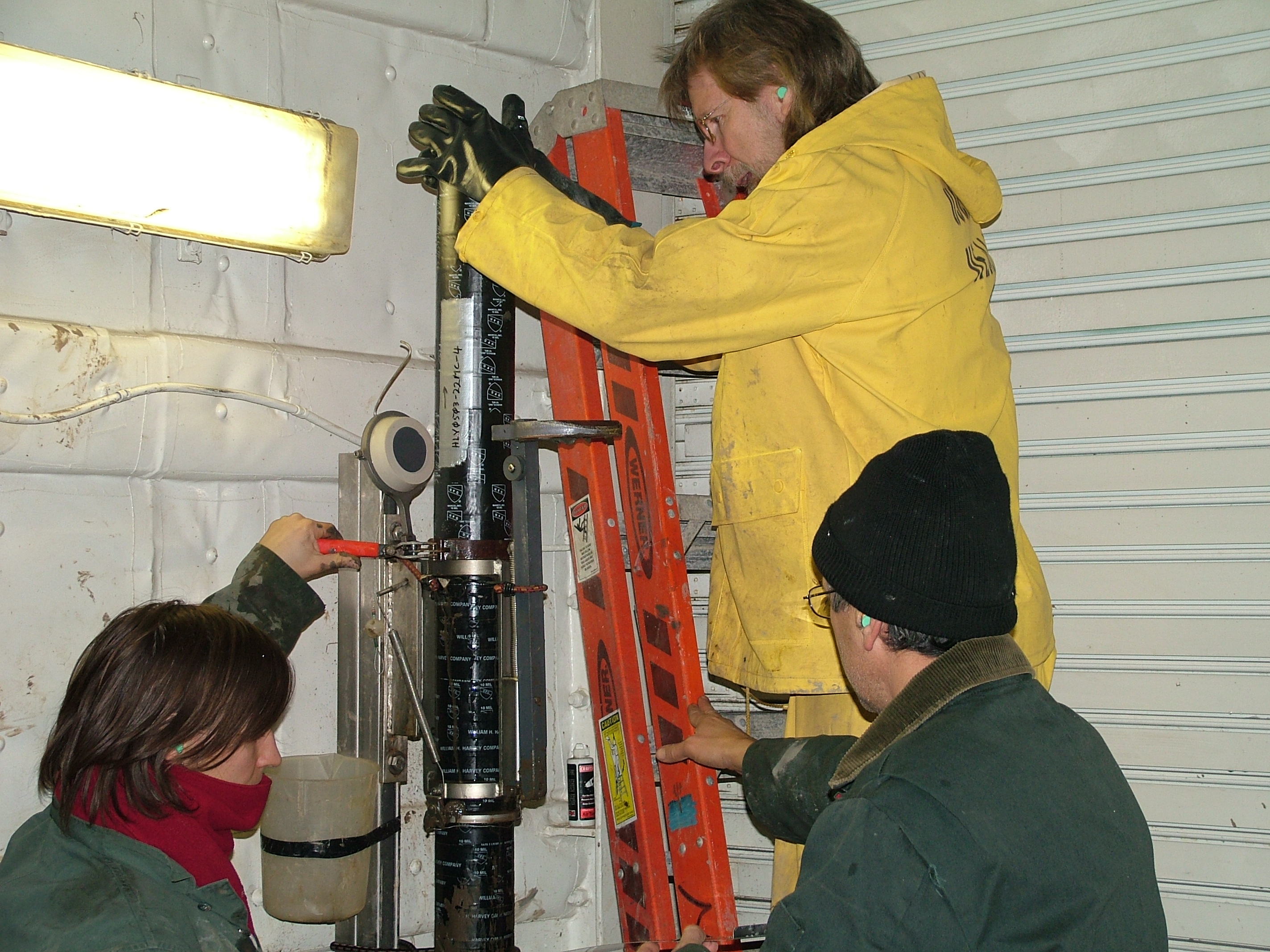 Researcher Dr. Glenn Berger of the Desert Research Institute processes a multicore sediment sample from the sea floor of the Arctic Ocean, on board the USCGC Healy.