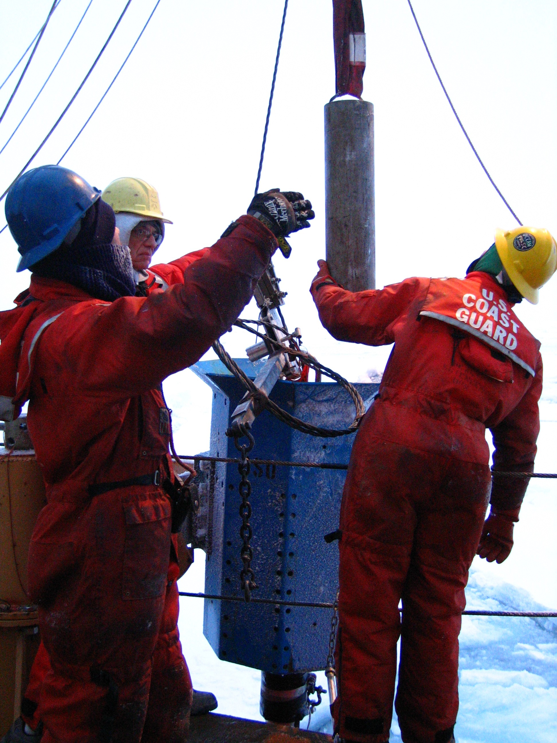Preparing to take a sea floor core with the Jumbo Piston Core (JPC) on board the USCGC Healy.