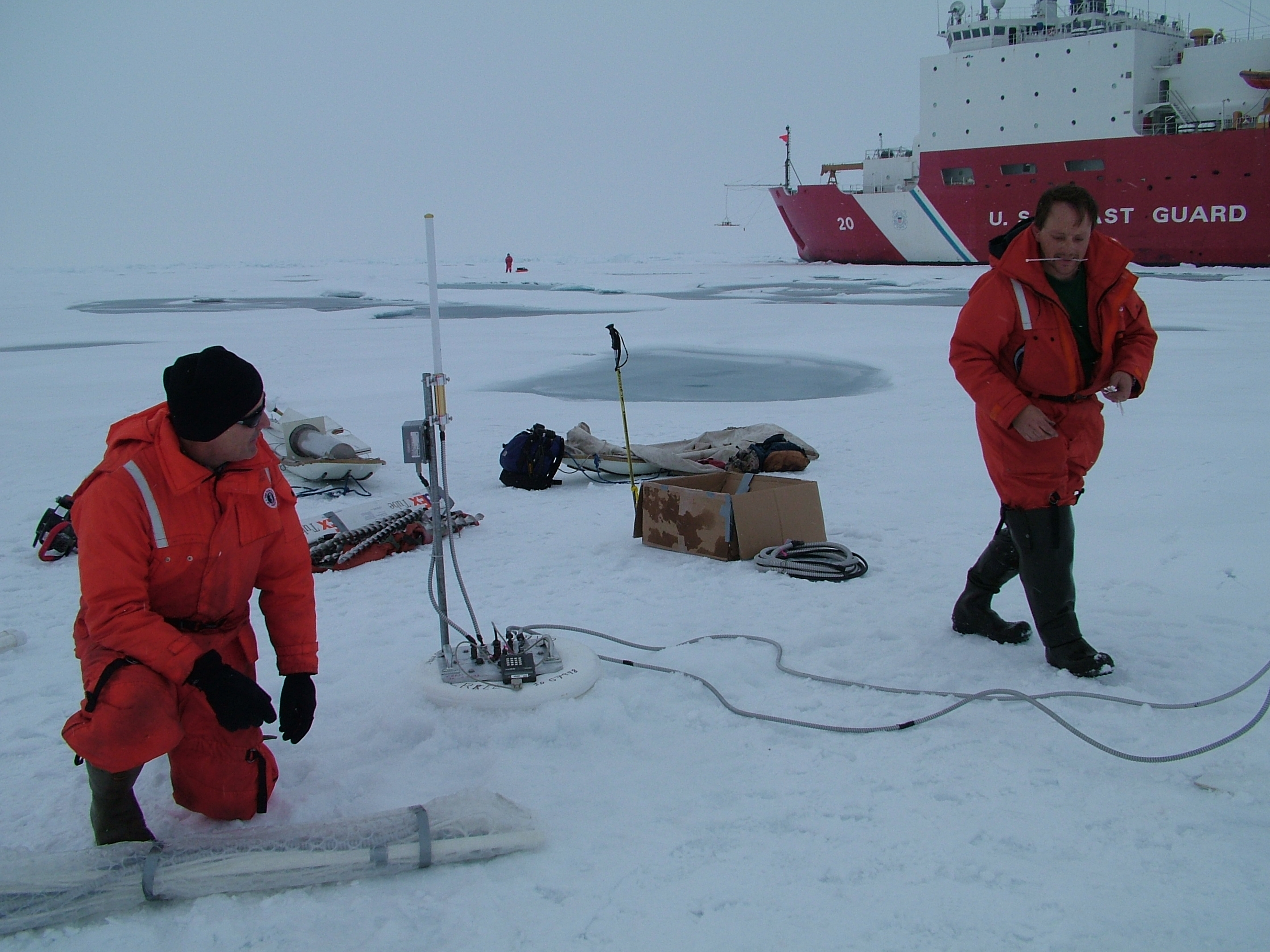 Setting up sampling devices on the ice of the Arctic Ocean with the USCGC Healy in the background.