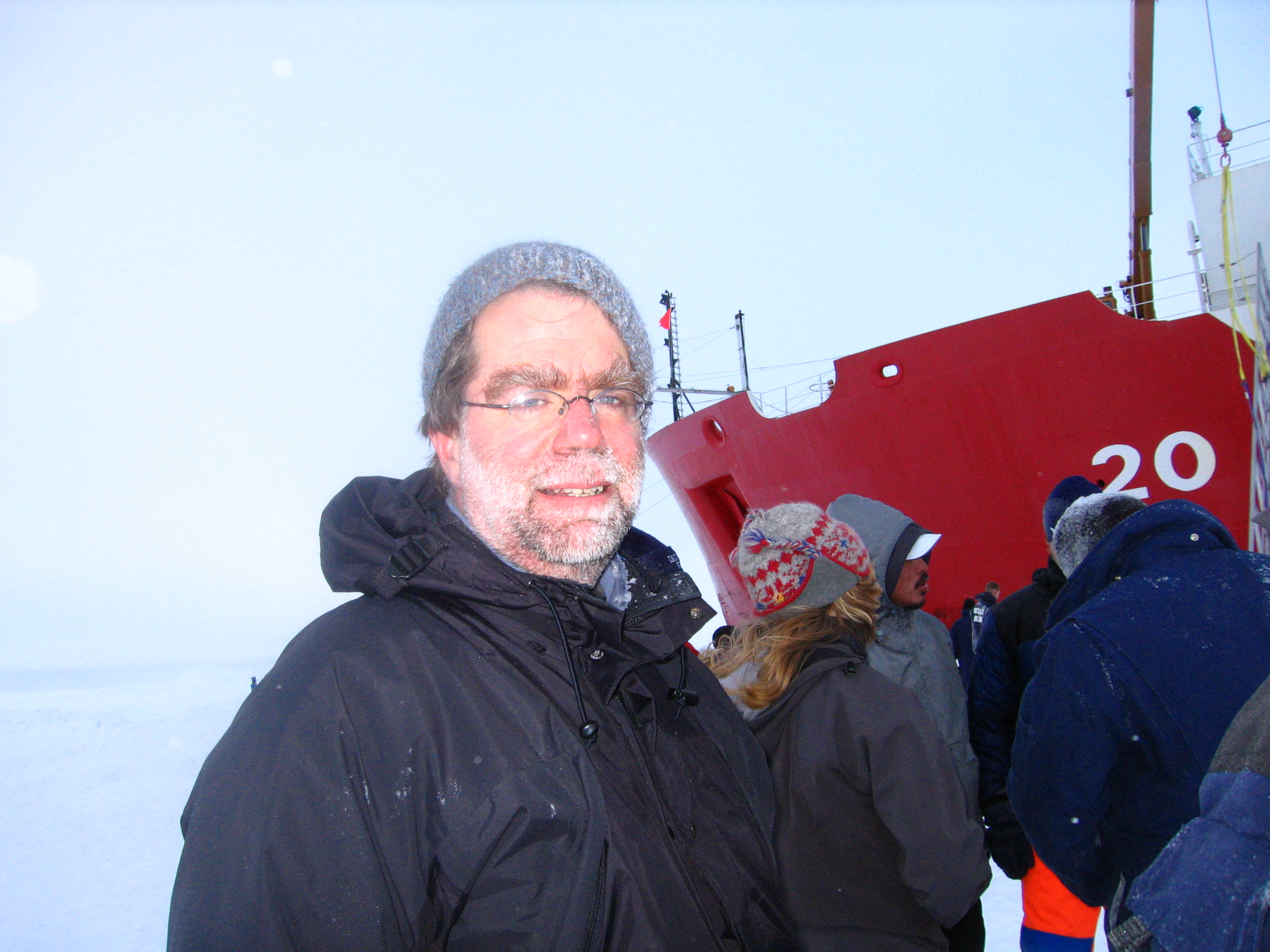 The crew of the USCGC Healy and researcher Dr. Bernie Coakley enjoy an ice liberty at the North Pole.